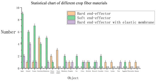 Figure 3 presents the statistical distribution of finger materials used for different crops. Based on the data from Appendix A, Table 3 summarizes the average success rate, harvesting cycle time, and damage rate associated with each type of finger material. The following analysis integrates the data in Table 3 with the advantages and disadvantages of each material to explain the proportional distribution observed in Figure 3.