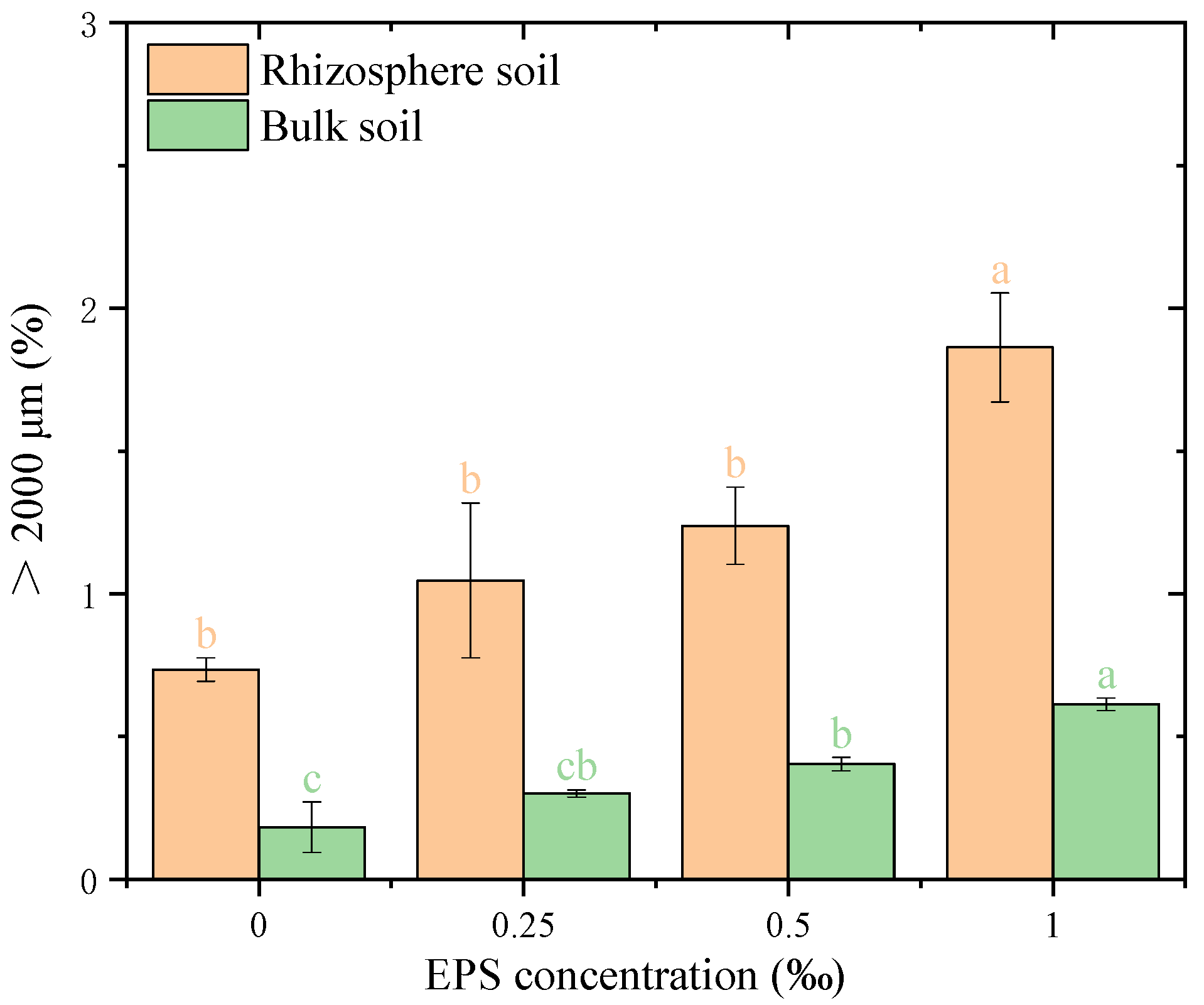 Figure 1. Distribution of >2000 μm water-stable aggregates under different exopolysaccharide concentrations. Different letters indicate significant differences among EPS treatments within the same soil zone (rhizosphere or bulk), based on one-way ANOVA followed by Tukey’s HSD (p < 0.05). Exact p-values and means ± SD are provided in Appendix A Table A1.