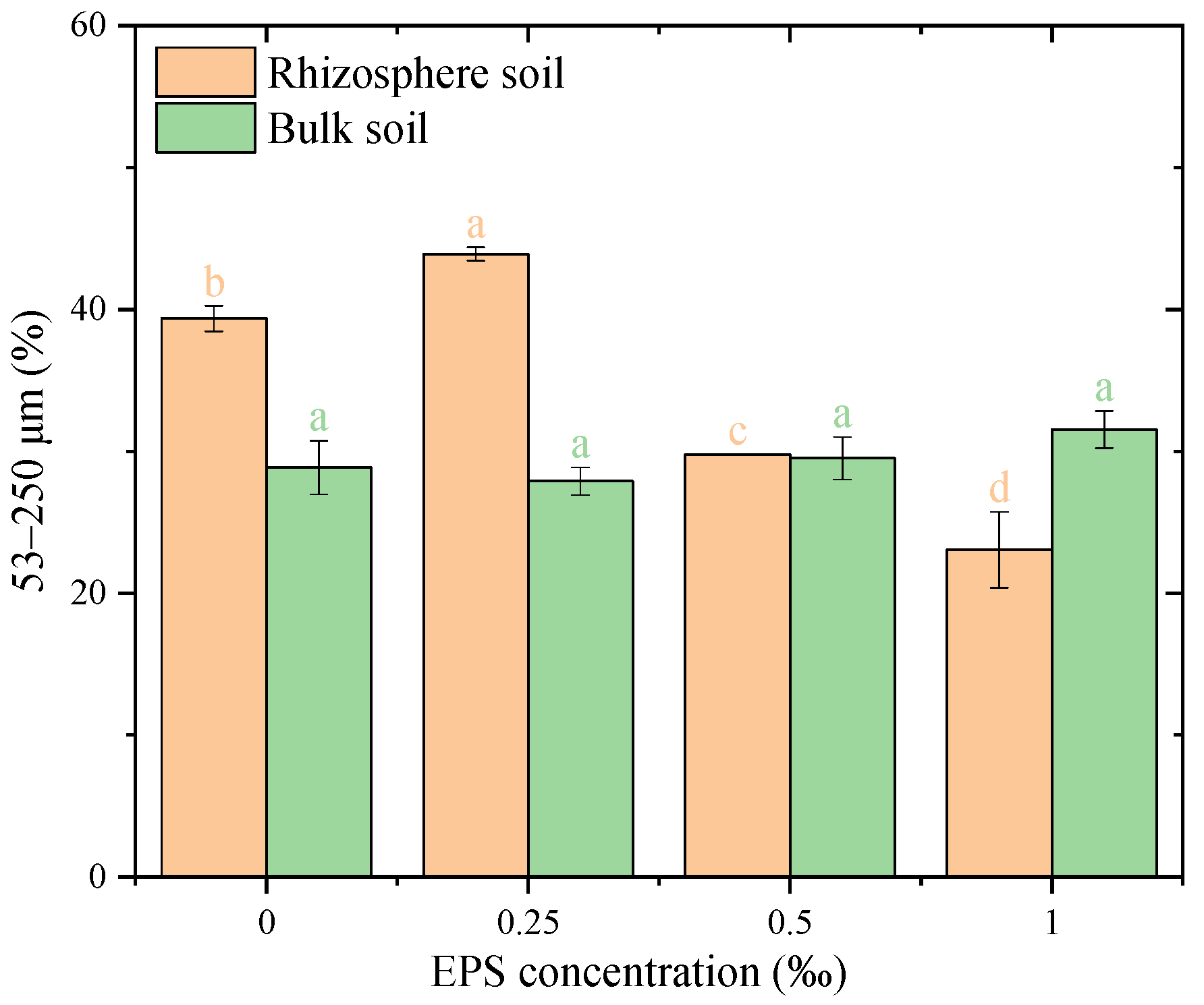 Figure 3. Distribution of 53–250 μm water-stable aggregates under different exopolysaccharide concentrations. Different letters indicate significant differences among EPS treatments within the same soil zone (rhizosphere or bulk), based on one-way ANOVA followed by Tukey’s HSD (p < 0.05). Exact p-values and means ± SD are provided in Appendix A Table A1.