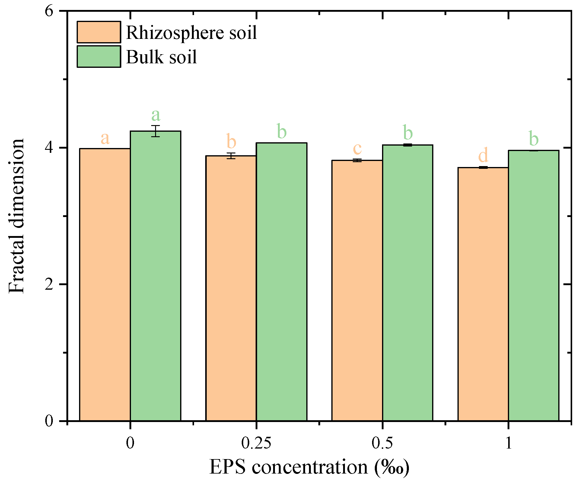 Figure 8. Fractal dimension of water-stable aggregates under different exopolysaccharide concentrations. Different letters indicate significant differences among EPS treatments within the same soil zone, based on one-way ANOVA followed by Tukey’s HSD (p < 0.05).