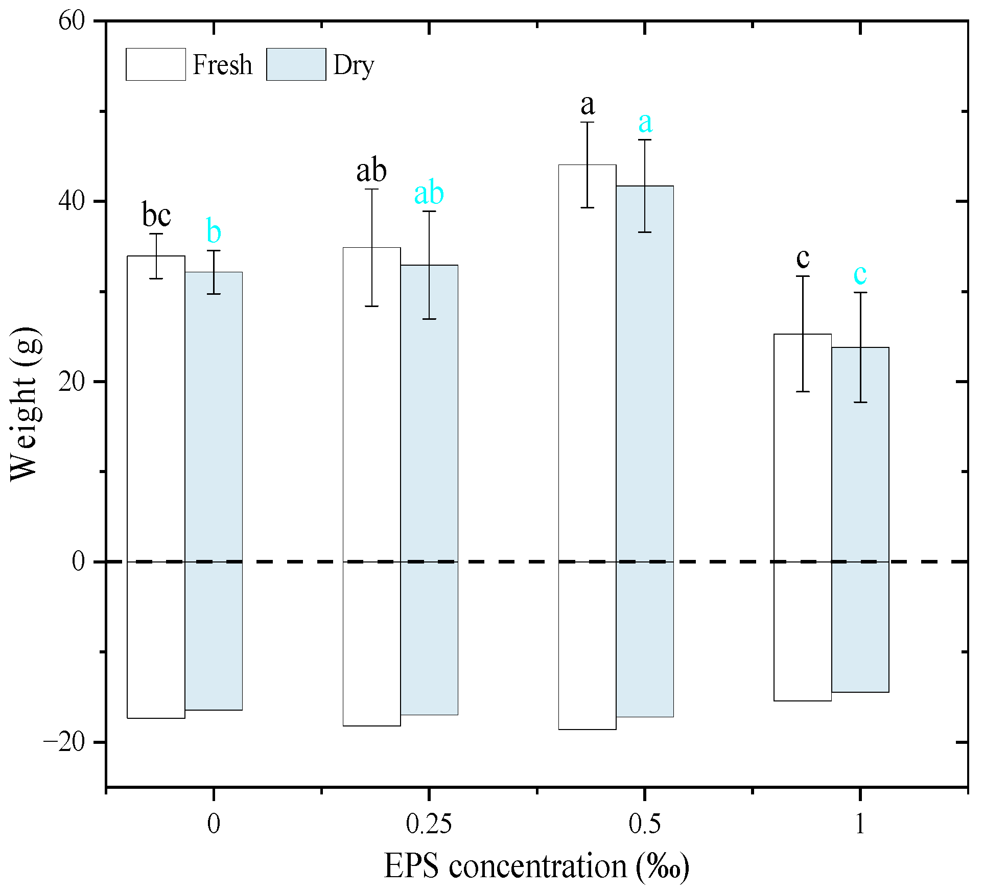Figure 9. The fresh weight and dry weight of Zea mays seedlings in response to soil water conditions with the addition of exopolysaccharides. A positive value represents the biomass of the above-ground stems and leaves of Zea mays seedlings, and a negative value represents the biomass of the under-ground root system of Zea mays seedlings. Different letters indicate significant differences among EPS treatments based on one-way ANOVA followed by Tukey’s HSD (p < 0.05).