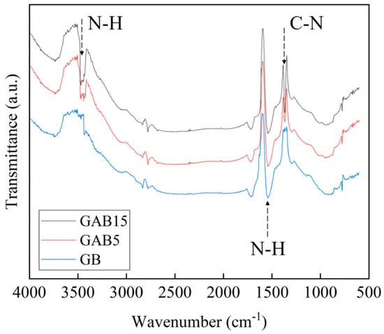 Fourier transform infrared spectroscopy analysis. Note: GAB15 refers to the treatment with fertilization + high-N activated biochar, GAB5 refers to the treatment with fertilization + low-N activated biochar, and GB refers to the treatment with fertilization + raw biochar.