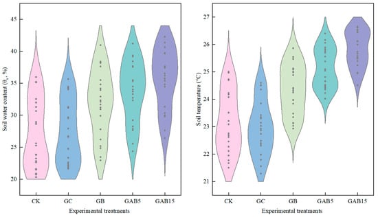 The effects of biochar application on soil moisture and temperature were evident (Figure 3). In general, the moisture content and temperature of the soil increased to varying extents following biochar addition. The soil moisture content for the GB, GAB5, and GAB15 treatments varied considerably, with average increases of 16.60%, 23.05% (p < 0.05), and 30.55% (p < 0.05), respectively, compared with the GC treatment. Similarly, the average soil temperature increased by 6.12%, 9.61% (p < 0.05), and 12.63% (p < 0.05), respectively.
