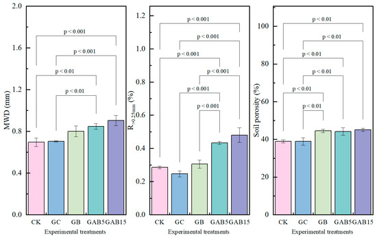 To assess the impact of biochar on soil aggregate stability, MWD and R>0.25mm were utilized in this study (Figure 4). Compared to the GC treatment, both GAB5 and GAB15 treatments exhibited a significant increase in MWD and R>0.25mm (p < 0.05), whereas the GB treatment did not reach a significant level. A statistically significant difference was observed between the GB and GAB15 treatments (p < 0.05); however, no significant difference was observed between GAB5 and GAB15. In contrast to the GC treatment, the soil porosities of GB, GAB5, and GAB15 increased by 14.48%, 13.56%, and 16.00%, respectively (p < 0.05), with no significant differences among the three treatments.