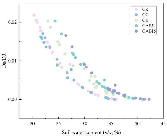 The relationship between Ds/D0 and soil water content is presented in Figure 5. With an increase in soil moisture content, Ds/D0 demonstrated an decreasing trend. When the soil moisture content was constant, the Ds/D0 for each treatment followed the order GAB15 > GAB5 > GB > GC/CK, indicating that biochar application increased soil gas diffusivity, with a more pronounced effect observed after biochar activation.
