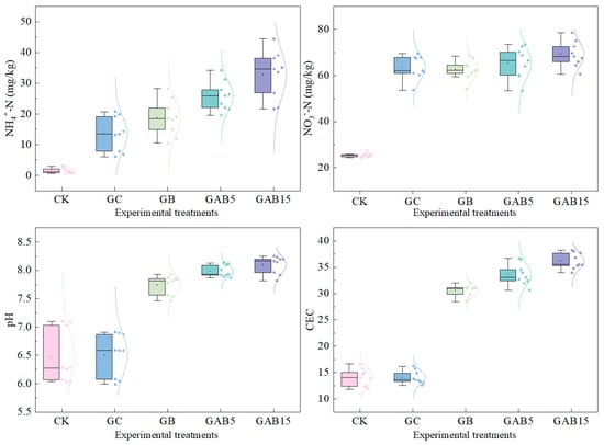 The soil pH and cation exchange capacity (CEC) in activated-biochar treatments were significantly higher than in other treatments (p < 0.05) (Figure 6). No significant differences were observed between GC and CK. Compared to GB, GAB15 treatment significantly increased soil pH and CEC by 4.9% and 17.3% (p < 0.05), respectively; GAB5 increased by 3.3% and 4.5%, respectively.