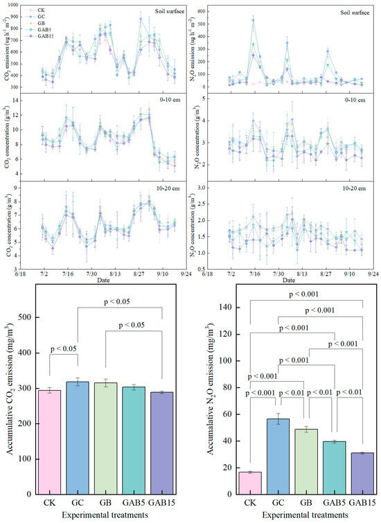 The dynamic of CO2 and N2O in the soil profile and surface. Note: CK is the control treatment, GC is the fertilization treatment, GAB15 refers to the treatment with fertilization + high-N activated biochar, GAB5 refers to the treatment with fertilization + low-N activated biochar, and GB refers to the treatment with fertilization + raw biochar.