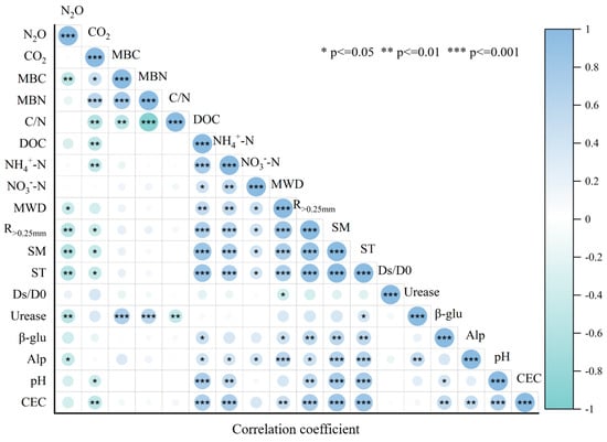 The correlation between soil N2O, CO2 emissions, and soil physicochemical property. Note: Pearson was used in the correlation analysis; MBC refers to microbial biomass carbon; MBN refers to soil microbial biomass nitrogen; C/N represents the ratio of MBC to MBN; DOC stands for dissolved organic carbon; MWD denotes Mean Weight Diameter; R>0.25mm represents the content of water-stable aggregates; SM stands for soil moisture; ST refers to soil temperature; Ds/D0 represents the gas diffusion coefficient; β-glu stands for β-glucosidase; Alp refers to alkaline phosphatase; pH denotes potential of Hydrogen; and CEC stands for cation exchange capacity.