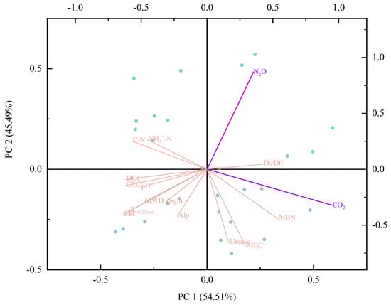 Correlation analysis was conducted between soil CO2 and N2O emissions and soil physicochemical properties (Figure 8). N2O was significantly negatively correlated with MBC (p < 0.05), MWD, R>0.25mm, soil moisture, soil temperature, urease, and alkaline phosphatase. CO2 was significantly positively correlated with MBC and MBN, and significantly negatively correlated with C/N, DOC, R>0.25mm, soil moisture, soil temperature, urease, and alkaline phosphatase (p < 0.05). To avoid collinearity among various indicators and further analyze the environmental factors affecting soil CO2 and N2O emissions, a redundancy analysis was conducted for each biochar treatment (Figure 9). PC1 and PC2 effectively explained the correlation between soil CO2, N2O, and soil environmental factors (88.8%). Specifically, urease, glucosidase, and alkaline phosphatase provided comprehensive explanatory powers of 97.6%, 52.9%, and 52.4%, respectively, for the response variables. CO2 was significantly positively affected by Ds/D0, MBC, MBN, and urease, and negatively affected by soil temperature and humidity, aggregate stability, C/N, DOC, CEC, and pH (p < 0.05). N2O was significantly positively affected by Ds/D0 and negatively affected by soil temperature, humidity, aggregate stability, C/N, CEC, pH, urease, β-glucosidase, and alkaline phosphatase (p < 0.05).