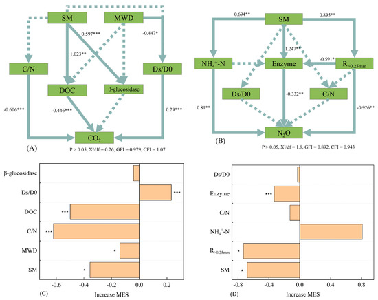 Based on previous studies and the hypotheses of this research, two independent theoretical models were preset to separately explain the emission pathways of CO2 and N2O. The CO2 emission model aims to test how soil moisture (SM), mean weight diameter (MWD), and their effects on microbial carbon-to-nitrogen ratio (MBC/MBN, C/N), dissolved organic carbon (DOC), β-glucosidase activity (β-gl), and gas diffusion coefficient (Ds/D0) ultimately influence CO2 emissions.