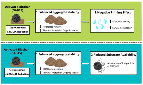 Soil N2O is primarily microbially produced via nitrification and denitrification, processes heavily dependent on inorganic nitrogen (NH4+-N and NO3−-N) availability. The key mechanism identified here was the reduced substrate availability for these processes (Figure 11). Activated biochar significantly enhanced aggregate stability, which limited organic nitrogen mineralization and reduced mineralization intensity (p < 0.05). This physical encapsulation mechanism, limiting substrate access to microbes, is a commonly cited explanation for biochar’s N2O mitigation [32,65] and was clearly operational in our system.
