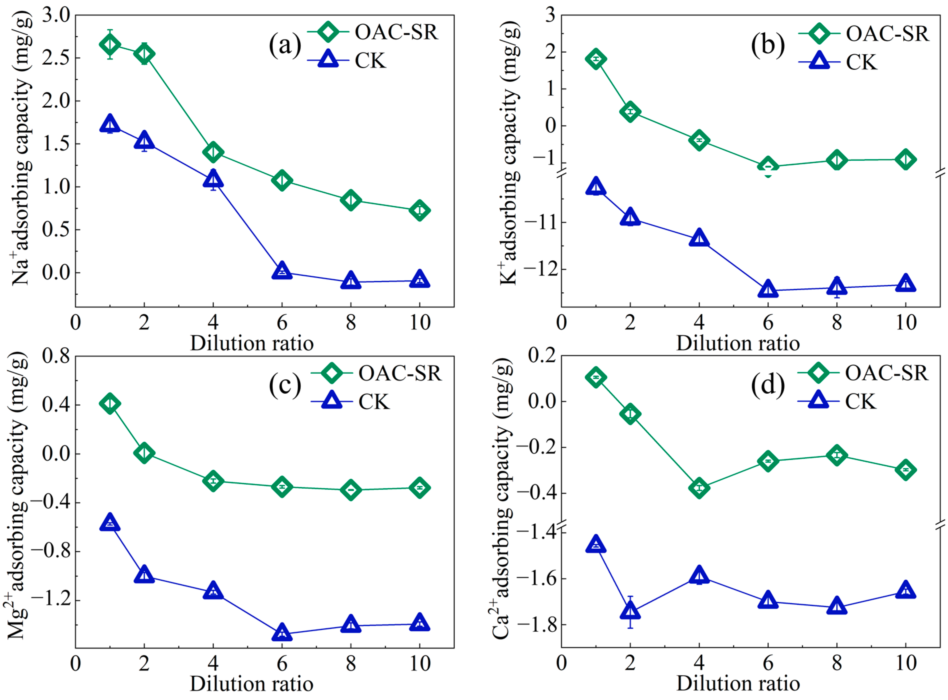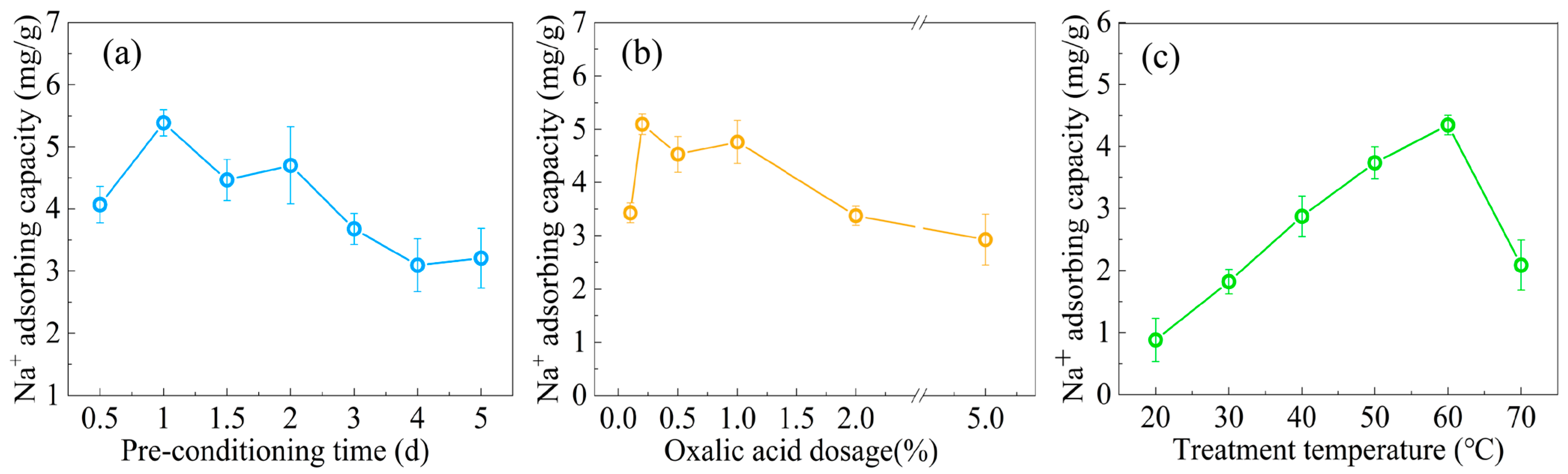 3.4.1. Effect of Adsorption Conditions on Na+ Adsorption of OAC-SR