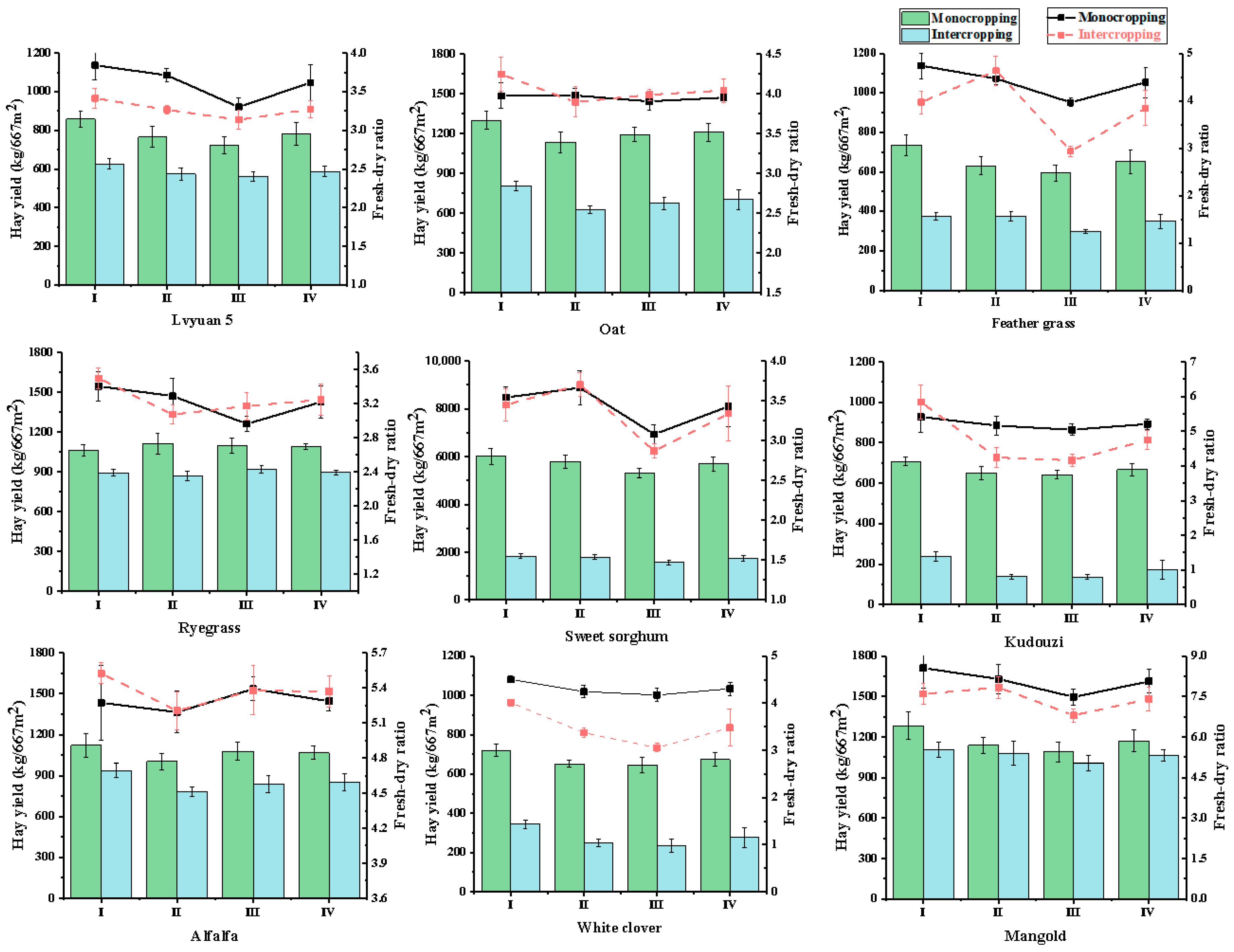 | Material | Cropping Pattern | Hay Yield (kg/667 m2) | Yield Change_I vs. M (%) | ||||