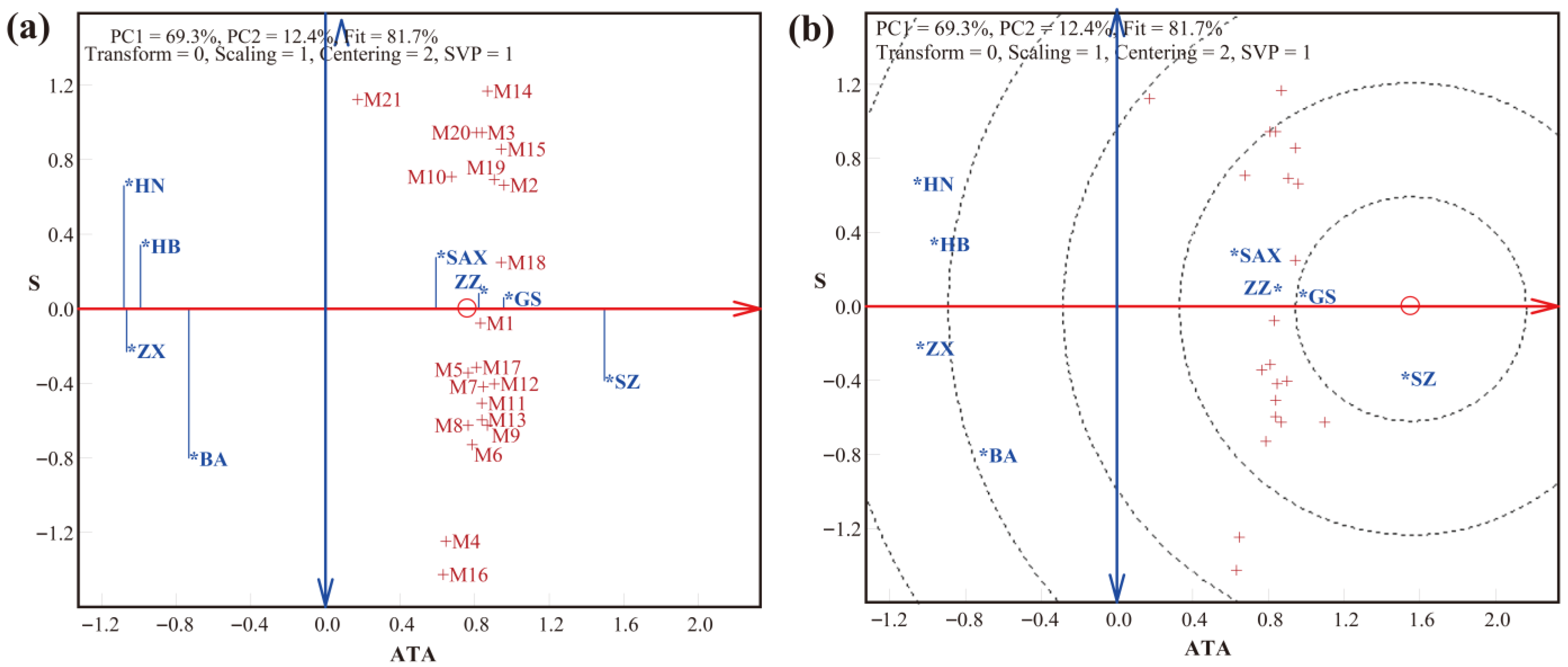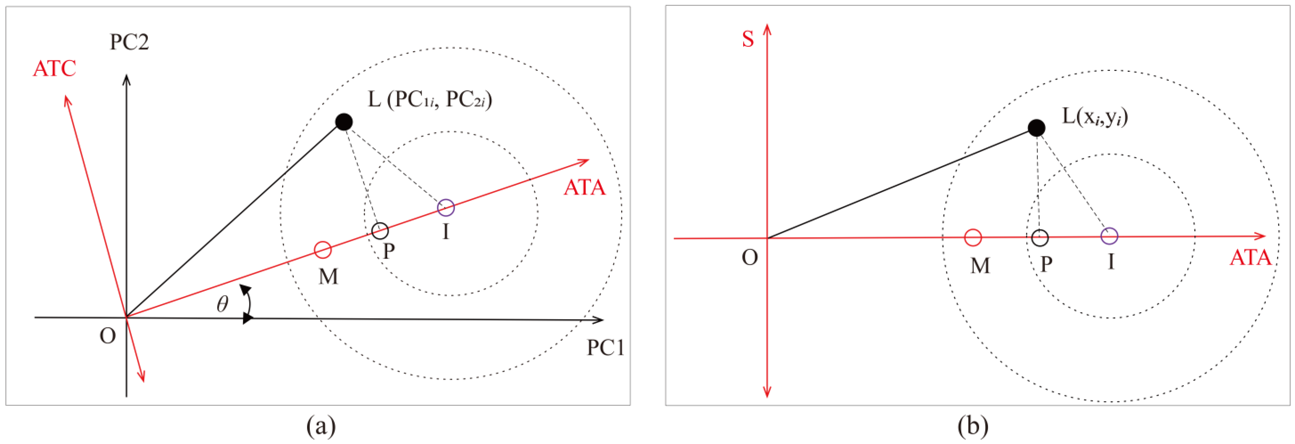 Information drawn from a GGE biplot is shown in Figure 1a, where the coordinates of laboratory i are represented by L (PC1i, PC2i). The average of all environment coordinates constitutes the average environment coordinates mark M (PC1jm, PC2jm). The ray passing through the origin and pointing to the average environment mark is the average tester axis (ATA), and the two-way ray perpendicular to the ATA passing through the origin is the average tester coordinate (ATC) [24]. Point P is the foot of the perpendicular from L to the ATA. Point I is the point on the positive direction of the ATA whose distance from the origin is equal to the longest laboratory vector, that is, the ideal laboratory mark [24]. The length of the line segment OP in the positive direction of the ATA represents the testing trueness, while LP and LI show the testing precision and accuracy, respectively. The shorter their values, the better they are. Figure 1a, therefore, gives a visual analysis of statistics such as the testing precision of a given laboratory. Nevertheless, due to the complexity of calculating the mathematical relations between the lengths of the aforementioned line segments (LP and LI), quantitative analysis of indicators like testing precision is not convenient.