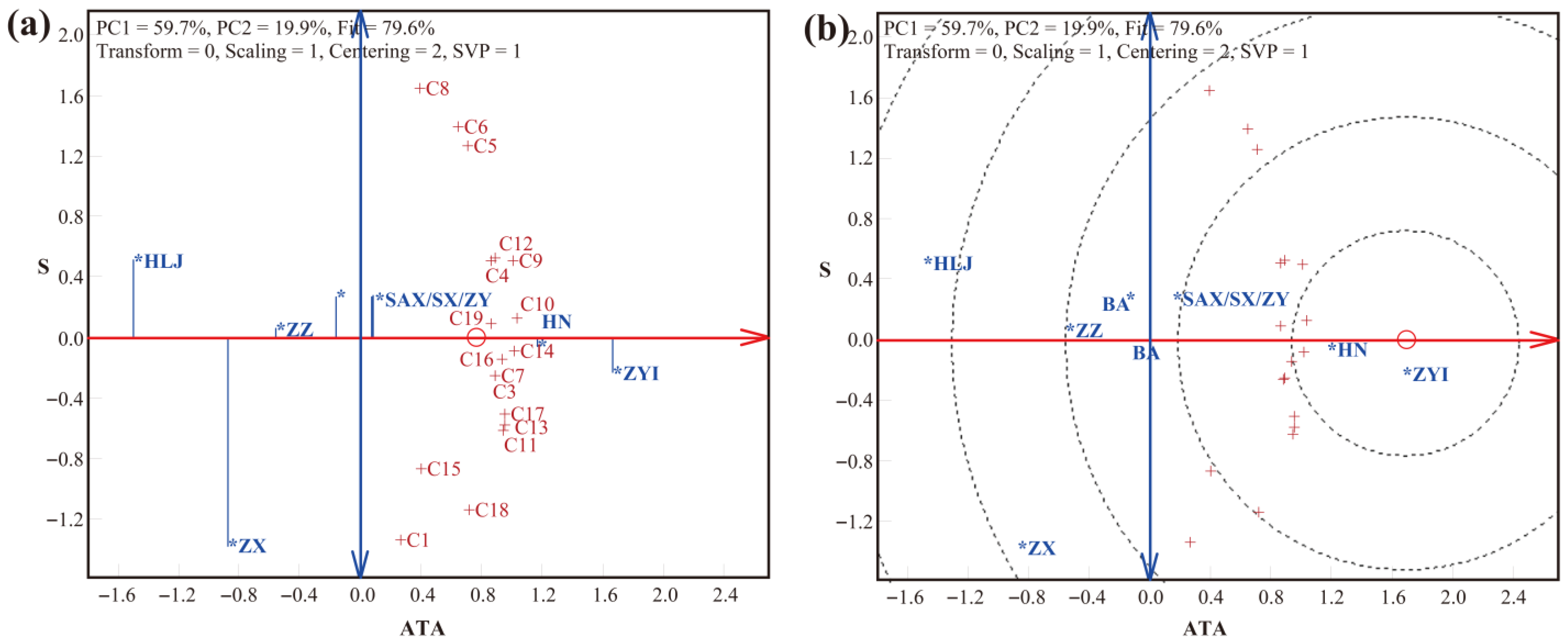 Before we present the proposed Lab plus Lab by Genotype interaction (LLG) biplot analysis, we will describe how graphical representation via GGE biplot analysis could have been conducted in our study. In our collaborative scheme, for each crop, p laboratories individually detected q genotypes under repeatability conditions. A laboratory × genotype trueness data matrix was formed by comparing the values of the detection results with those of the reference, according to Equation (1), so as to enable GGE biplot analysis. In such an analysis, the traditional “environment factor” is substituted by the genotype factor and the “genotype factor” is replaced by the laboratory factor. After centering the data matrix with respect to the environment, singular value decomposition and partitioning are applied to simplify it into the sum of n products of laboratory principal components (PCi, i = 1, 2, …, n) and genotype principal components (PCj, j = 1, 2, …, n). The first two principal components (PC1 and PC2) of each laboratory and genotype are used as coordinates in a rectangular coordinate system to construct a GGE biplot. In this biplot, each laboratory and genotype is represented by a mark with PC1 and PC2 scores as its coordinates [24,25].