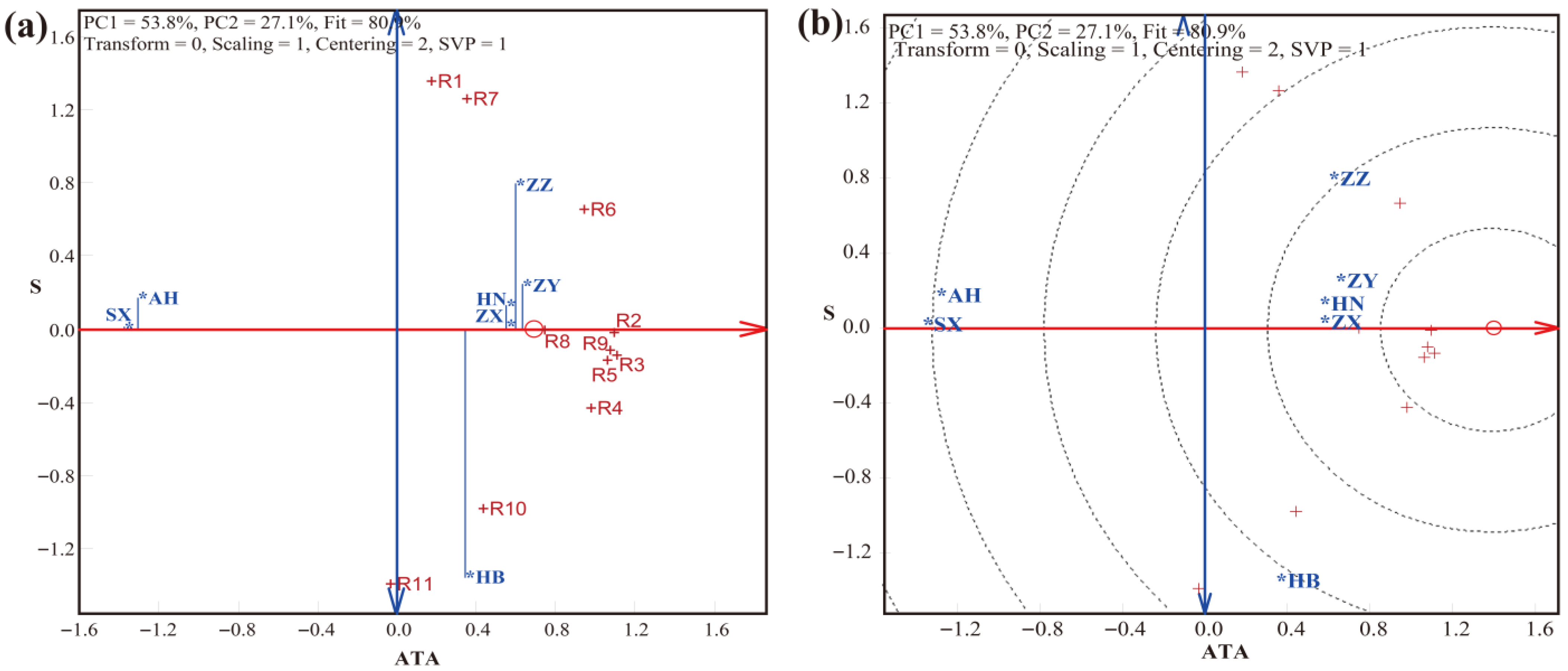 For rice genotypes (Figure 4a), the detection trueness of laboratories ZY, ZZ, ZX, and HN was higher compared to that of laboratories HB, AH, and SX. With regard to detection precision, laboratories SX and ZX exhibited the best level, those of laboratories HN, AH, and ZY were relatively good, and laboratories ZZ and HB were the worst. The interaction between laboratories and genotypes was significant; for instance, genotypes R10 and R11 had a significant positive interaction in laboratory HB, and negative interactions in laboratories ZZ and AH. Consequently, laboratories ZY, ZX, and HN achieved the best level of detection accuracy (Figure 4b), that of laboratories HB and ZZ was relatively good, and laboratories AH and SX were the worst.