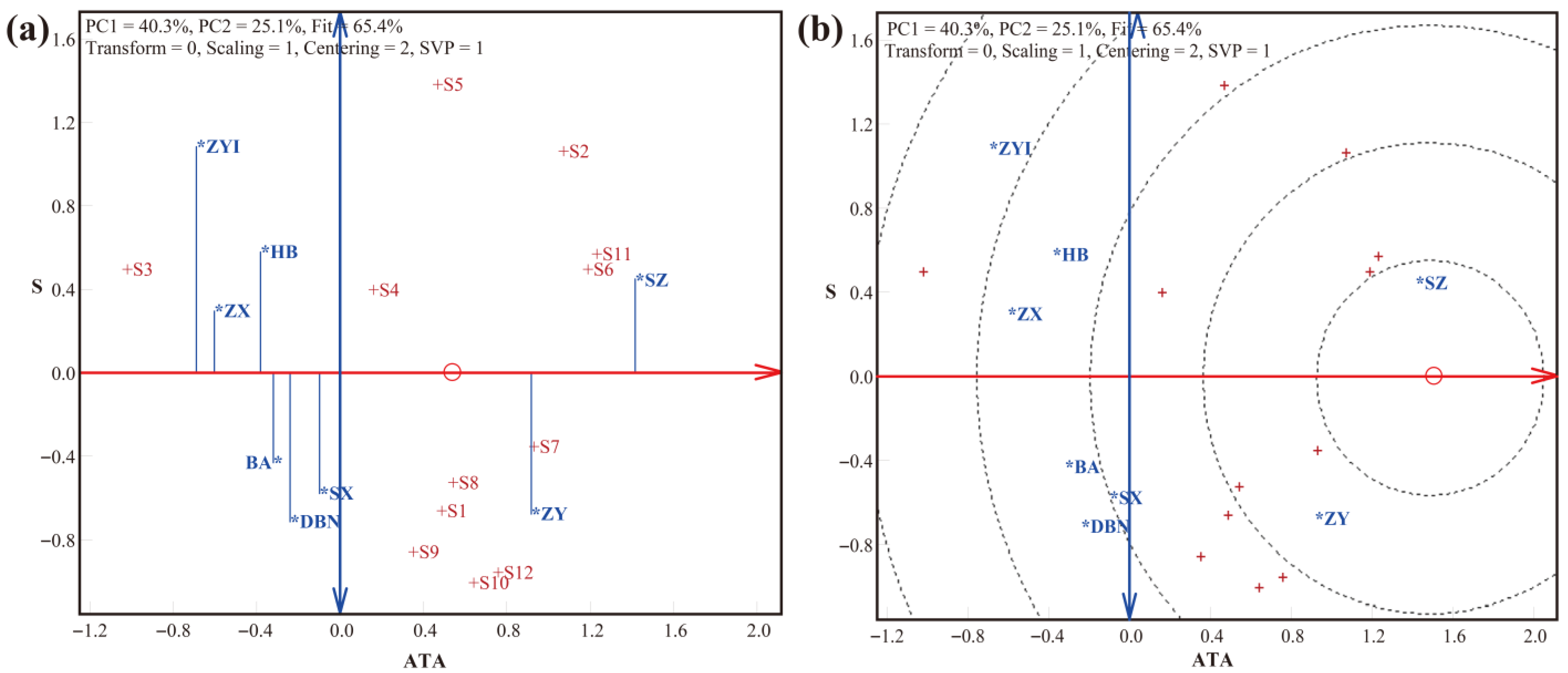 For soybean genotypes (Figure 5a), laboratories SZ and ZY had a relatively high level of detection trueness, and the remaining laboratories an average level. Laboratories ZX, BA, and SZ showed relatively good detection precision compared to laboratory ZYI, while the remaining laboratories achieved a medium level. The interaction between laboratories and genotypes was notable; for instance, genotypes S5, S2, and S11 had significant positive interactions in laboratory SZ and significant negative interactions in laboratories DBN, SX, and BA. Consequently, laboratory SZ achieved the best level of detection accuracy (Figure 5b), and laboratory ZY was relatively good compared to the medium level of the remaining laboratories.