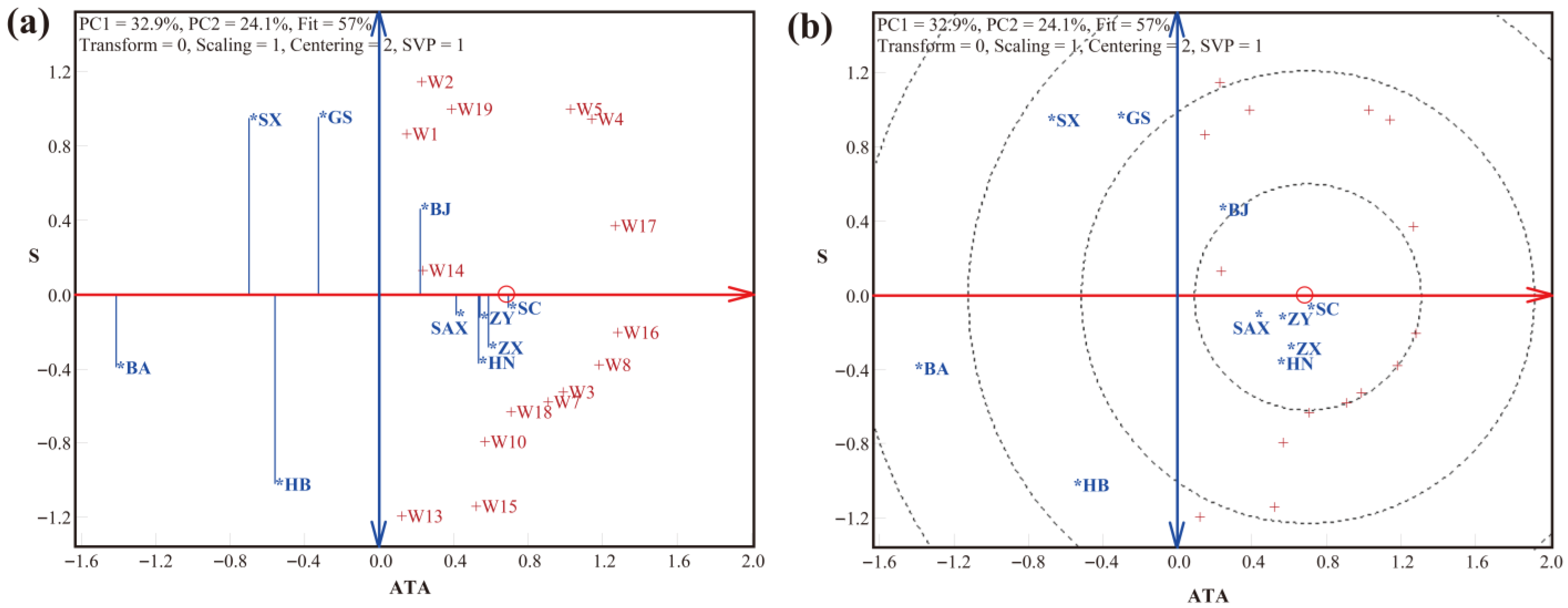 For wheat genotypes (Figure 6a), the detection trueness of laboratories SC, ZX, ZY, HN, and SAX was high, compared to that of laboratories BJ, GS, HB, SX, and BA. With regard to detection precision, laboratories SC, SAX, and ZY reached the highest level, and those of laboratories ZX, HN, BA, and BJ were relatively good compared to laboratories SX, GS, and HB, which were the worst. The interaction between laboratories and genotypes was significant; for instance, genotypes W13, W15, and W10 had significant positive interactions with laboratory HB, but significant negative interactions with laboratories SX, GS, and BJ. Consequently, laboratories SC, ZX, ZY, HN, and SAX all achieved the best level of detection accuracy (Figure 6b), while that of laboratory BJ was relatively good compared to laboratories GS, HB, SX, and BA, which were the worst.