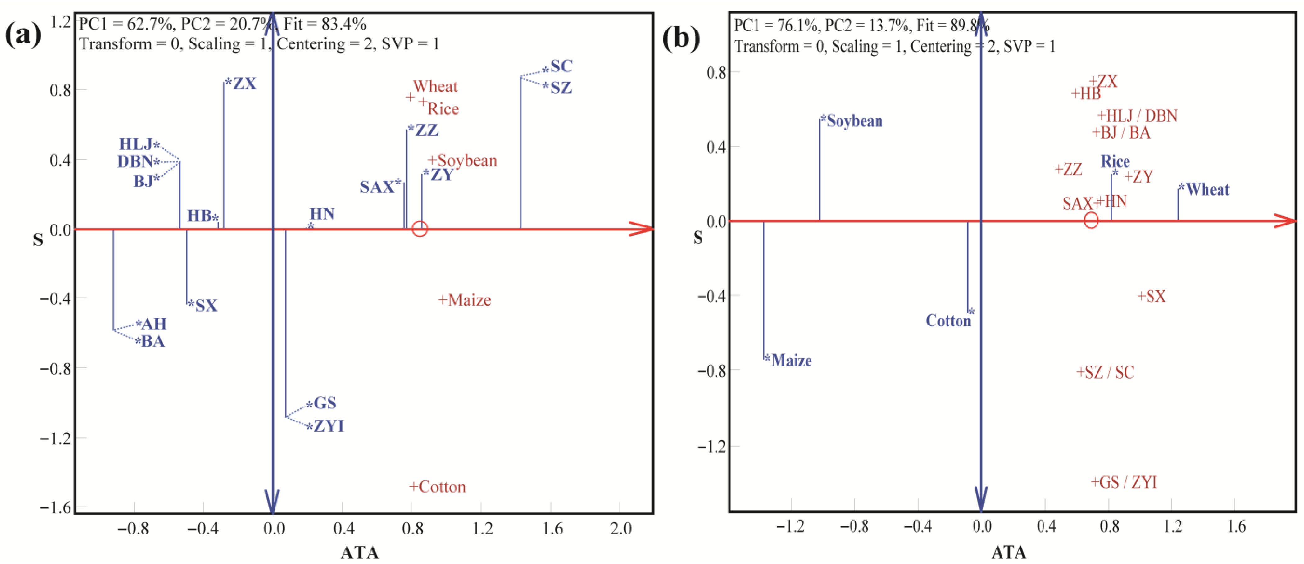 Finally, our study proposes an improvement in the graphical representation of detection reliability statistics, an area previously explored by very few works. In the proposed LLG biplot, a variation in the GGE biplot [25,34], detection trueness and precision are clearly displayed, as the horizontal coordinate axis is merely the ATA, representing the direction of high detection trueness, while the arrow of the vertical coordinate S axis points towards the direction of poor detection precision (Figure 1). The two views of the LLG biplot illustrate the detection reliability statistics in a complementary way: in the trueness–precision view, the abscissa of the laboratory directly indicates the detection trueness, while the absolute value of the ordinate represents precision; in the ideal–laboratory view, the difference between the abscissa of the ideal laboratory mark and that of a given laboratory represents accuracy. This study revealed that, among the laboratories participating in the detection experiment, SZ and SC achieved the best detection accuracy, ZY, AX, HN, GS, BJ, ZYI, and ZZ achieved relatively good detection accuracy, DBN, ZX, SX, and HB achieved average detection accuracy, and BA, AH, and HLJ achieved poor detection accuracy. It also revealed the overall performance ranking of the detection accuracy of the crops to be, in descending order, wheat > rice > cotton > soybean > maize. We therefore believe that the application of the LLG biplot can present the trueness, precision, and accuracy of SNP marker detection more intuitively, efficiently, and simply.