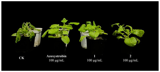 The efficacies of 1 and 2 against P. capsici were tested by using zoospores in a greenhouse test [24]. For the assays, water was used as a negative control, and azoxystrobin was used as a positive control at 100 μg/mL. The plants (Nicotiana benthamiana) were cultured in a 100 cm2 pot with vermiculite and reached the vegetative growth stage for testing. The concentrations of 1 and 2 were diluted to 100 μg/mL, and 40 mL were used for each treatment. Then, the zoospore suspension of P. capsici (1 × 105 cfu mL−1) was conducted after 24 h. All the treated plants were placed in the greenhouse at 25 °C with 85% relative humidity for 4–8 days to observe disease status and control effect [25,26]. All assays were repeated at least three times.