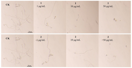 A mycelial plug (5 mm in diameter) of S. sclerotiorum cut from the periphery of a 3-day-old colony was inoculated in 50 mL of sterilized PDB broth and cultivated at 25 °C with shaking at 150 rpm for 36 h. After that, compounds 1 and 2 with a final concentration of 50 μg/mL were added to the broth, and methanol was set as a control. A mycelial plug (5 mm in diameter) of P. capsici was inoculated into a Petri dish (90 cm) with 15 mL of V8 media and cultivated stationarily at 25 °C for 24 h. After that, compounds 1 and 2 with a final concentration of 50 μg/mL were added to the media. After incubation for 12 h, the mycelia were centrifuged at 4000× g for 10 min at 4 °C; the collected mycelia were treated as described by reference [30]. The mycelial morphology was observed under a transmission electron microscope (TEM) (Hitachi H-7650, Hitachi Co., Tokyo, Japan).