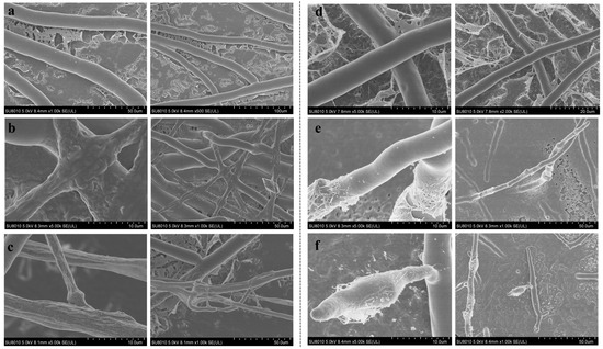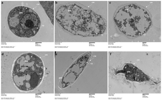 Moreover, the effects of compounds 1 and 2 on the hyphal ultrastructure of S. sclerotiorum and P. capsici were observed via TEM. The control sample displayed a normal hyphal ultrastructure of intact and smooth cell membranes, in addition to well-organized cytoplasm and mitochondria (Figure 6a,d). In the sample treated with two compounds, the hyphae’s cell membranes became rough and invaginated, and organelles were disordered (Figure 6b,c,e,f). Furthermore, it was observed that cytoplasm was lost due to plasma membrane dissociation and cell wall disruption in the treatment.