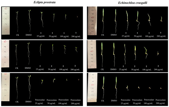 In recent years, interest in natural products with herbicidal activity as new tools for integrated weed management has increased; therefore, we further tested the herbicidal activity of compounds 1 and 2. An assay to evaluate the effectiveness of compounds 1 and 2 on the radicle and germ elongation of two weed species was conducted using the above method. The results showed that compounds 1 and 2 exhibited great inhibitory activities against radicle and germ growth. As shown in Figure 7 and Table 4, compounds 1 and 2 almost completely inhibited the radicle growth of the monocotyledon species Echinochloa crusgalli at 200 μg/mL with inhibition ratios of 97.2% and 91.7%, respectively. Additionally, compound 1 had good activity against the radicle and germ elongation of dicotyledon species Eclipta prostrata, with an inhibition ratio of 100% at 200 μg/mL, which was consistent with the positive control penoxsulam at the same concentration.