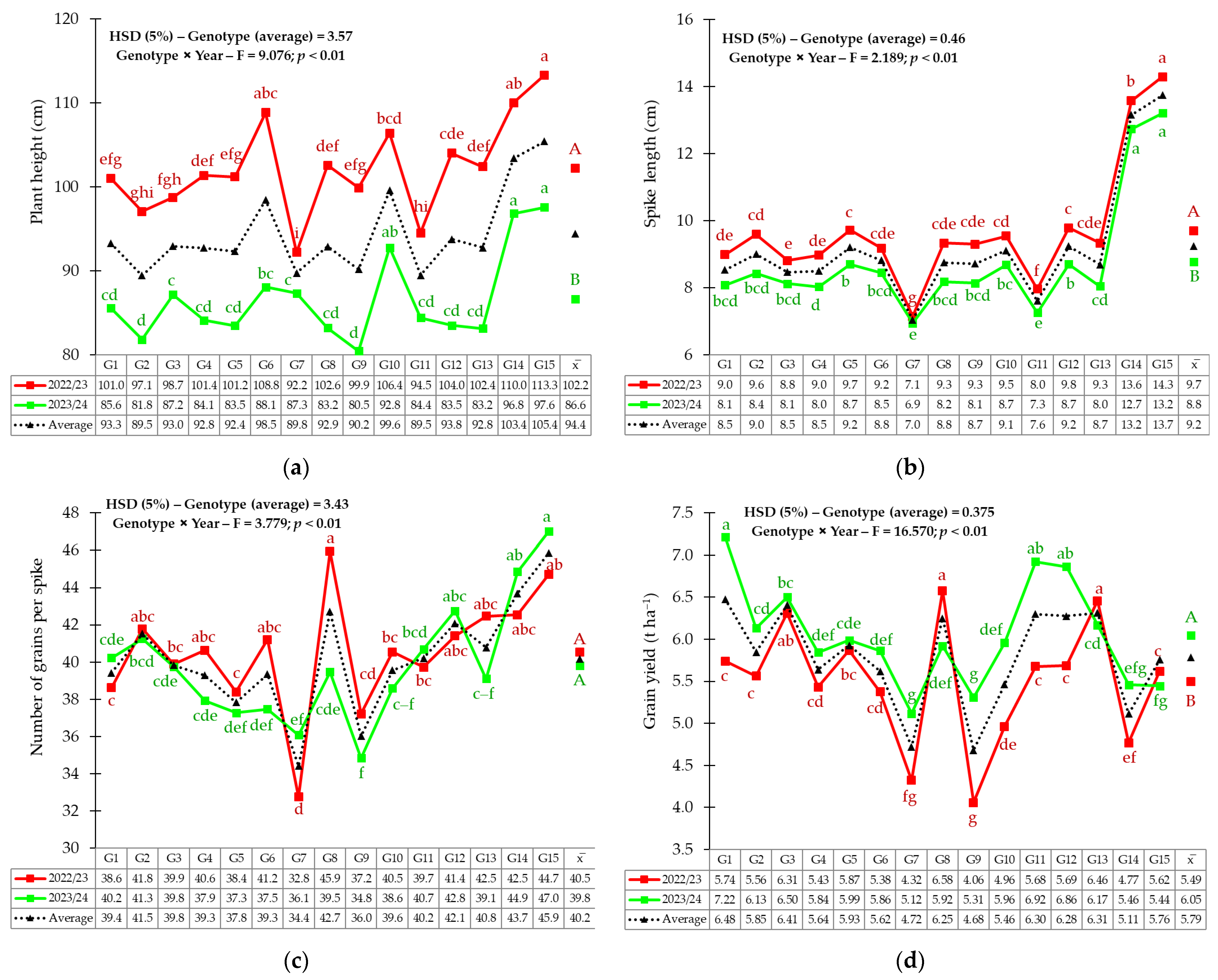- Ghafoor, A.Z.; Ceglińska, A.; Karim, H.; Wijata, M.; Sobczyński, G.; Derejko, A.; Studnicki, M.; Rozbicki, J.; Cacak-Pietrzak, G. Influence of Genotype, Environment, and Crop Management on the Yield and Bread-Making Quality in Spring Wheat Cultivars. Agriculture 2024, 14, 2131. [Google Scholar] [CrossRef]