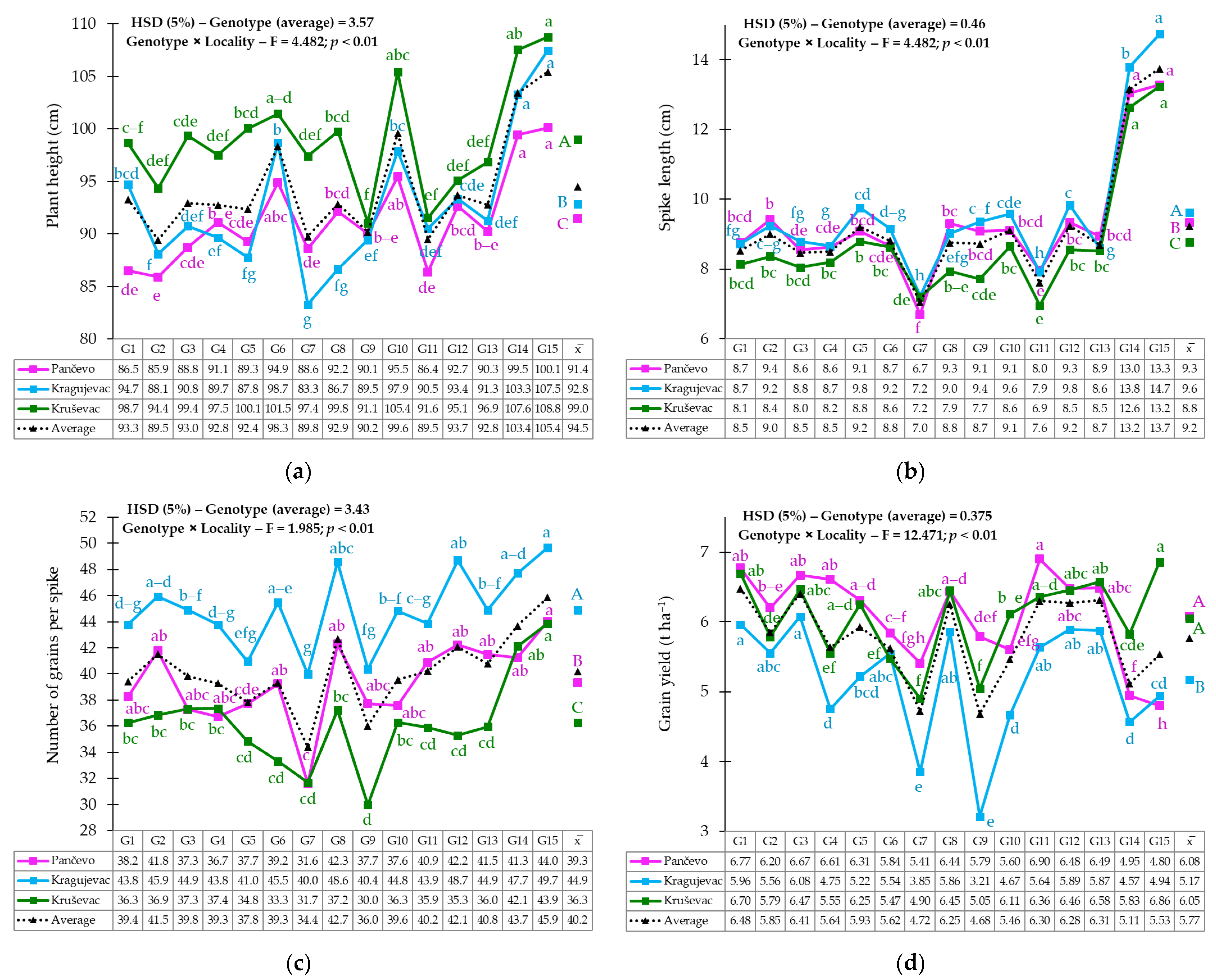 - Mladenov, V.; Dimitrijević, M.; Petrović, S.; Boćanski, J.; Banjac, B.; Kondić-Špika, A.; Trkulja, D. Genetic Analysis of Spike Length in Wheat. Genetika 2019, 51, 167–178. [Google Scholar] [CrossRef]