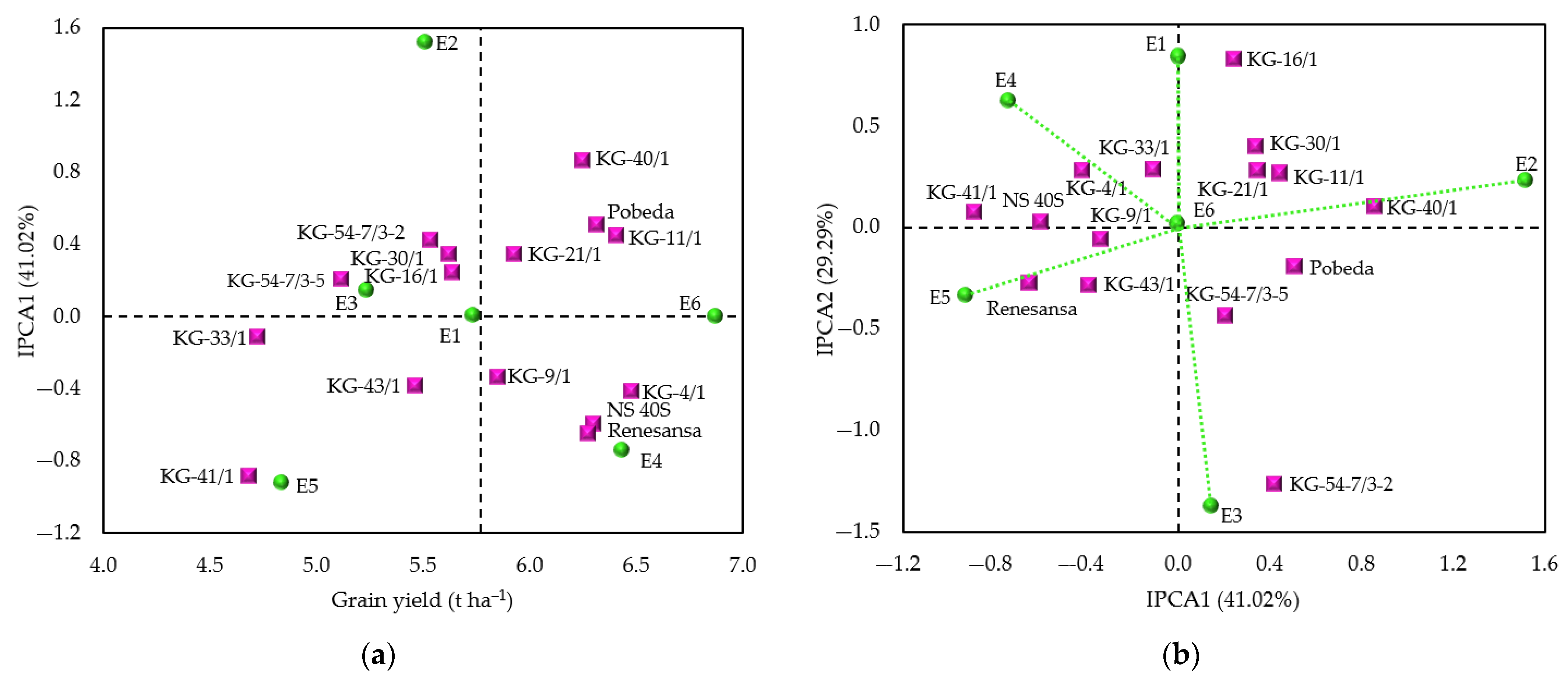 - Taherian, M.; Saeidnia, F.; Hamid, R.; Nazeri, S.M. Identification of High-Yielding and Stable Cultivars of Wheat under Different Sowing Dates: Comparison of AMMI and GGE-Biplot Analyses. Heliyon 2024, 10, e39599. [Google Scholar] [CrossRef]