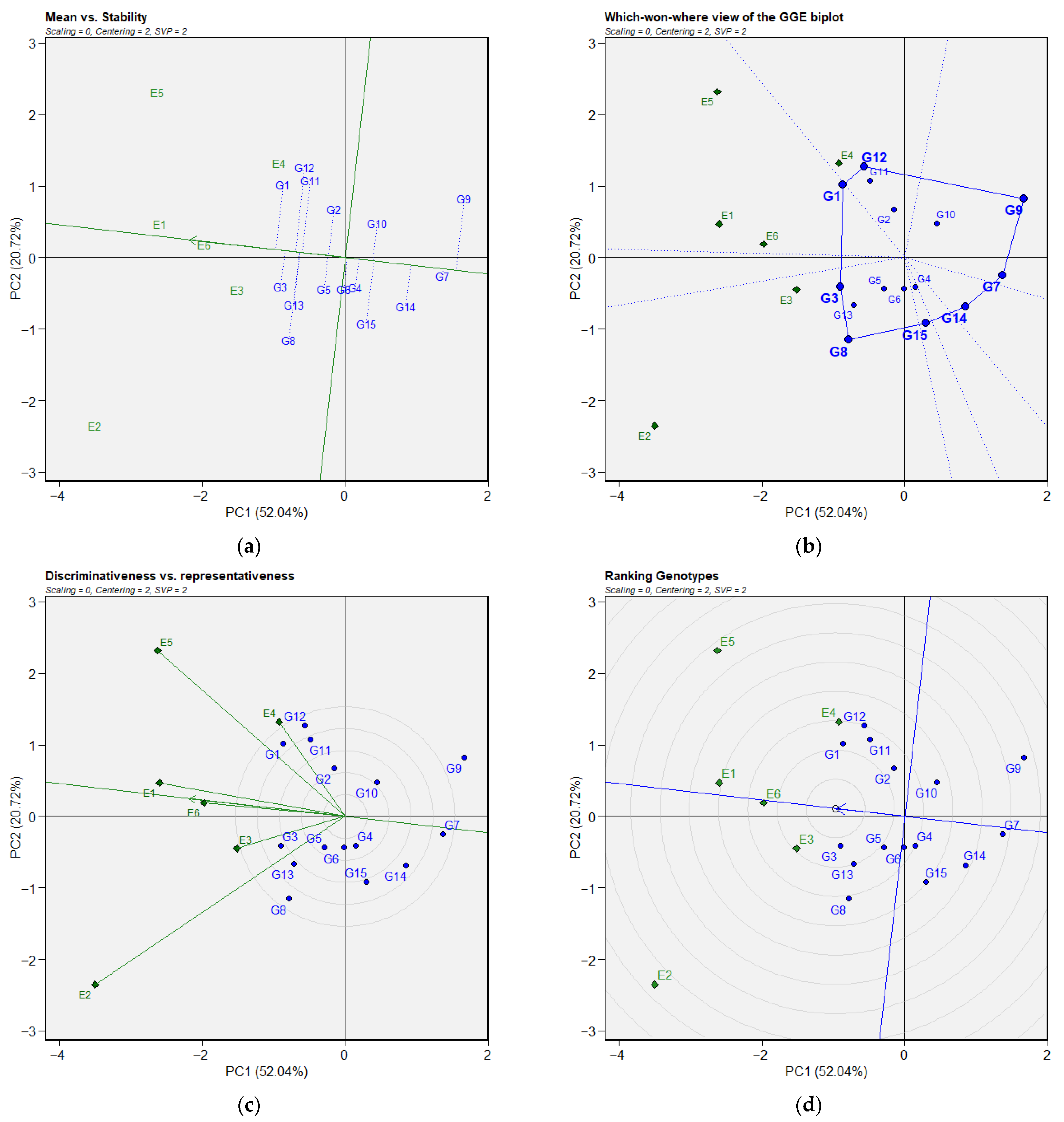 - Yan, W.; Hunt, L.A.; Sheng, Q.; Szlavnics, Z. Cultivar evaluation and mega-environment investigation based on the GGE biplot. Crop Sci. 2000, 40, 597–605. [Google Scholar] [CrossRef]