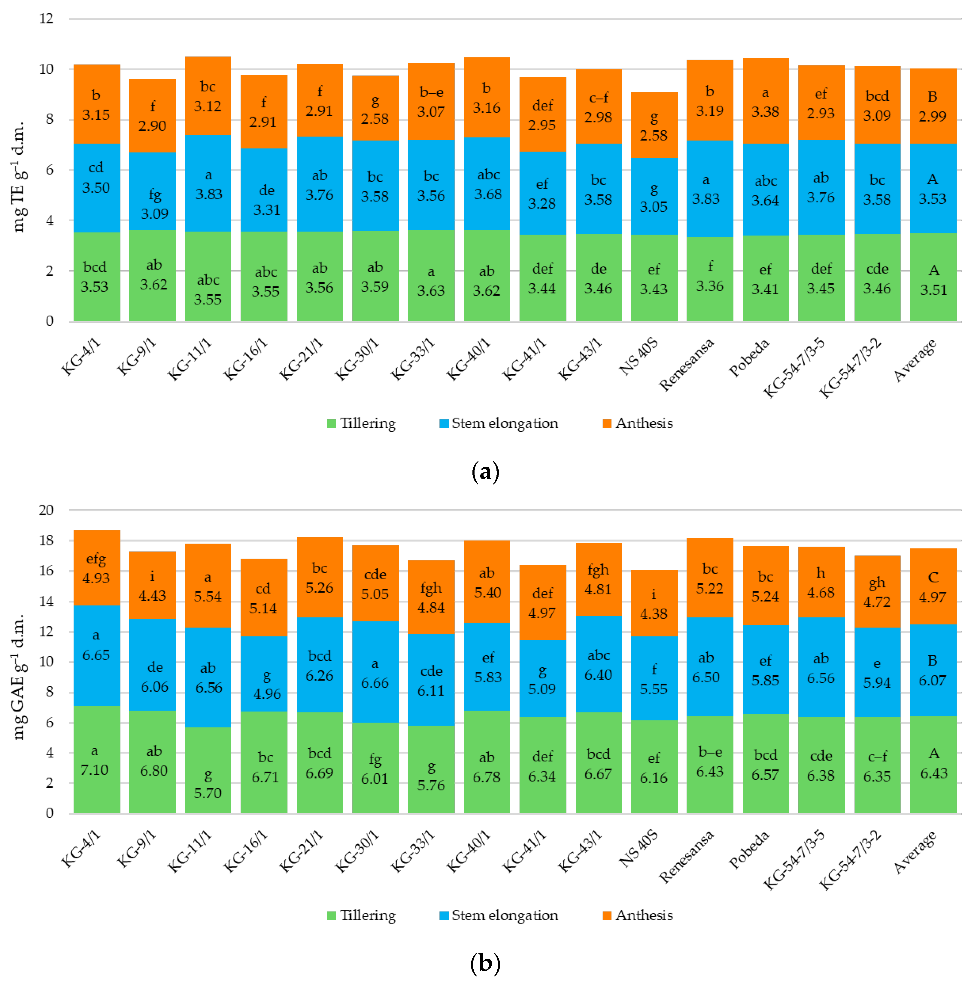 - Melios, S.; Ninou, E.; Irakli, M.; Tsivelika, N.; Sistanis, I.; Papathanasiou, F.; Didos, S.; Zinoviadou, K.; Karantonis, H.C.; Argiriou, A.; et al. Effect of Genotype, Environment, and Their Interaction on the Antioxidant Properties of Durum Wheat: Impact of Nitrogen Fertilization and Sowing Time. Agriculture 2024, 14, 328. [Google Scholar] [CrossRef]