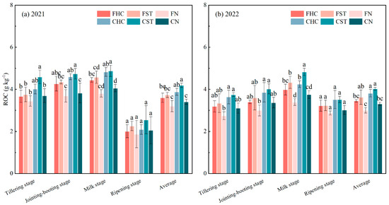 ROC at different rice growth stages in 2021 and 2022 is shown in Figure 1. In 2021, ROC content ranged from 1.88 g kg−1 (FN) to 4.88 g kg−1 (CST), whereas in 2022, it varied from 2.74 g kg−1 (FN) to 4.83 g kg−1 (CST). CI increased soil ROC compared with FI. Specially, compared to FN, CN increased the average ROC content by 6.37% in 2021 and 10.34% in 2022. Treatments with hydrochar or straw application showed a greater increase in soil ROC under CI. EOC addition further increased ROC content in different growth stages of rice, with values exceeding those under CK by 1.90–24.38% in 2021 and by 12.12–28.65% in 2022. Straw incorporation resulted in higher ROC than hydrochar incorporation, with increases ranging from 1.15 to 22.06% in 2021 and 0.17 to 13.65% in 2022 at different growth stages of rice. Overall, both CI and EOC addition promoted soil ROC, with the highest levels observed in CST. Furthermore, the average ROC contents in CHC and CST treatments were 7.83% and 12.19% (p < 0.05) higher than those in FHC and FST, respectively, in 2021, and 10.50% (p < 0.05) and 11.12% higher in 2022.