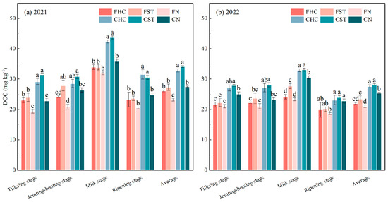Soil dissolved organic carbon (DOC) content at different growth stages of rice in 2021 and 2022. FHC, flooding irrigation with straw-derived hydrochar; FST, flooding irrigation with rice straw input; FN, flooding irrigation with no exogenous organic carbon addition; CHC, controlled irrigation with straw-derived hydrochar; CST, controlled irrigation with rice straw input; CN, controlled irrigation with no exogenous organic carbon addition. Error bars represent standard error (n = 3). Different lowercase letters above each bar indicate significant differences among different treatments at p < 0.05.