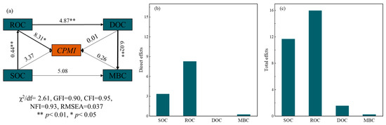 The structural equation modeling of soil carbon pool management index (CPMI) and its influencing factors (a), and the direct effect (b) and total effect (c) of ROC, DOC, MBC, and SOC on CPMI. ROC: readily oxidizable organic carbon; DOC: dissolved organic carbon; MBC: microbial biomass carbon. df: degrees of freedom; χ2/df: Chi-square divided by degrees of freedom GFI: goodness-of-fit index; CFI: comparative fit index; NFI: normed fit index; RMSEA: root mean square error of approximation. Single arrows indicate hypothesized causal directions. Black and red arrows represent significant positive and negative correlations, respectively. Numbers on arrows indicate standardized path coefficients, and arrow width represents the magnitude of their path coefficients. * on arrows indicate significance, with * representing significance at p < 0.05 and ** representing significance at p < 0.01.