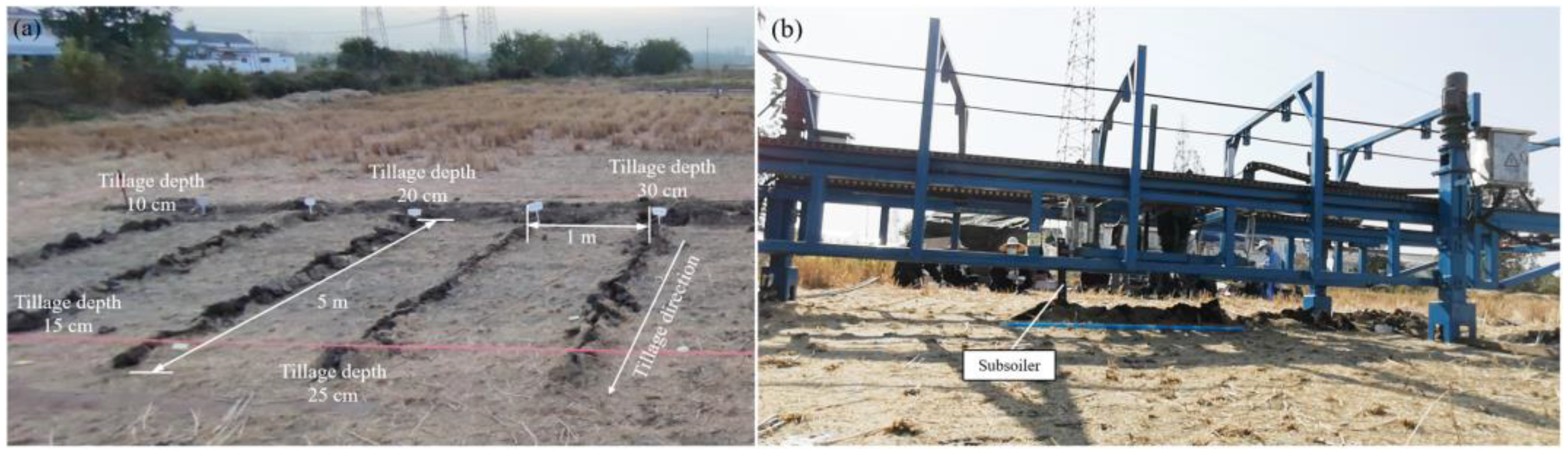 - Kong, F.X.; Jiu, A.; Kan, Z.; Zhou, J.; Yang, H.; Li, F.-M. Deep tillage combined with straw biochar return increases rice yield by improving nitrogen availability and root distribution in the subsoil. Field Crops Res. 2024, 315, 109481. [Google Scholar] [CrossRef]