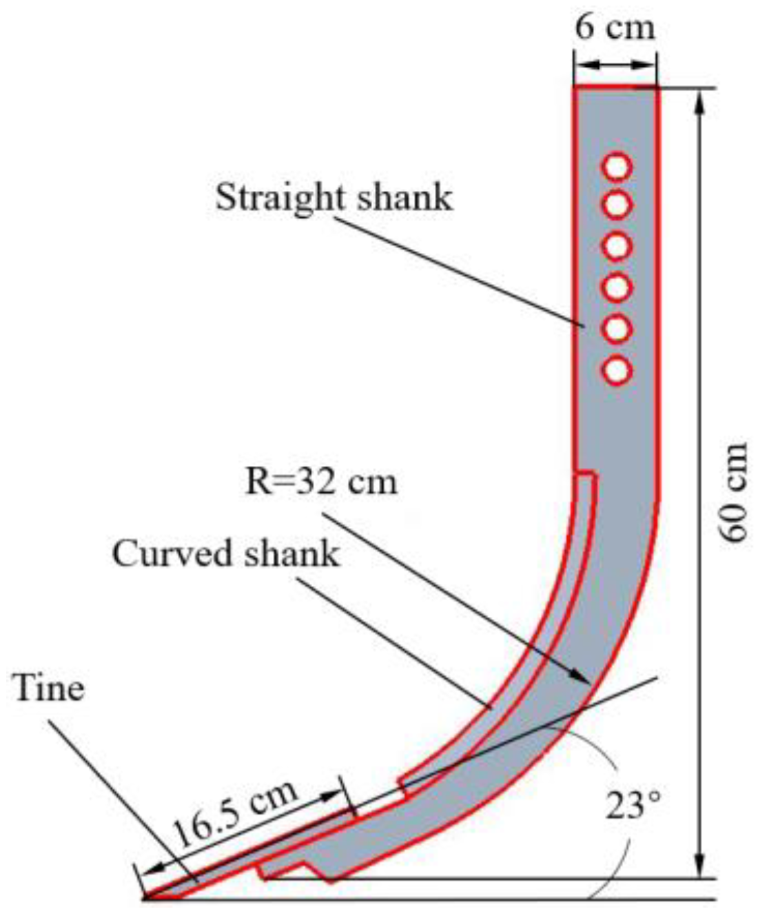 - Tong, J.; Jiang, X.H.; Wang, Y.M.; Ma, Y.H.; Li, J.W.; Sun, J.Y. Tillage force and disturbance characteristics of different geometric-shaped subsoilers via DEM. Adv. Manuf. 2020, 8, 392–404. [Google Scholar] [CrossRef]
