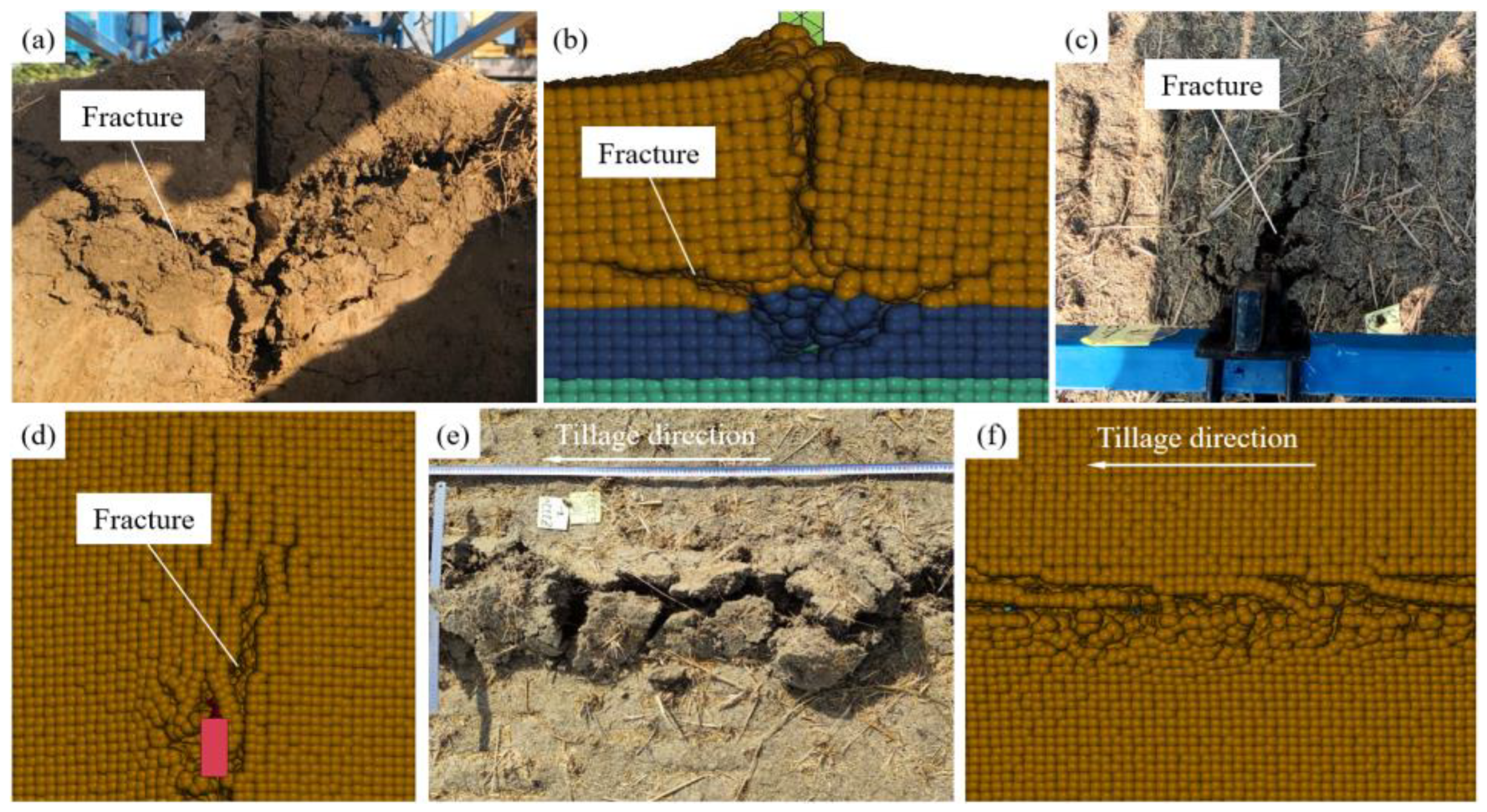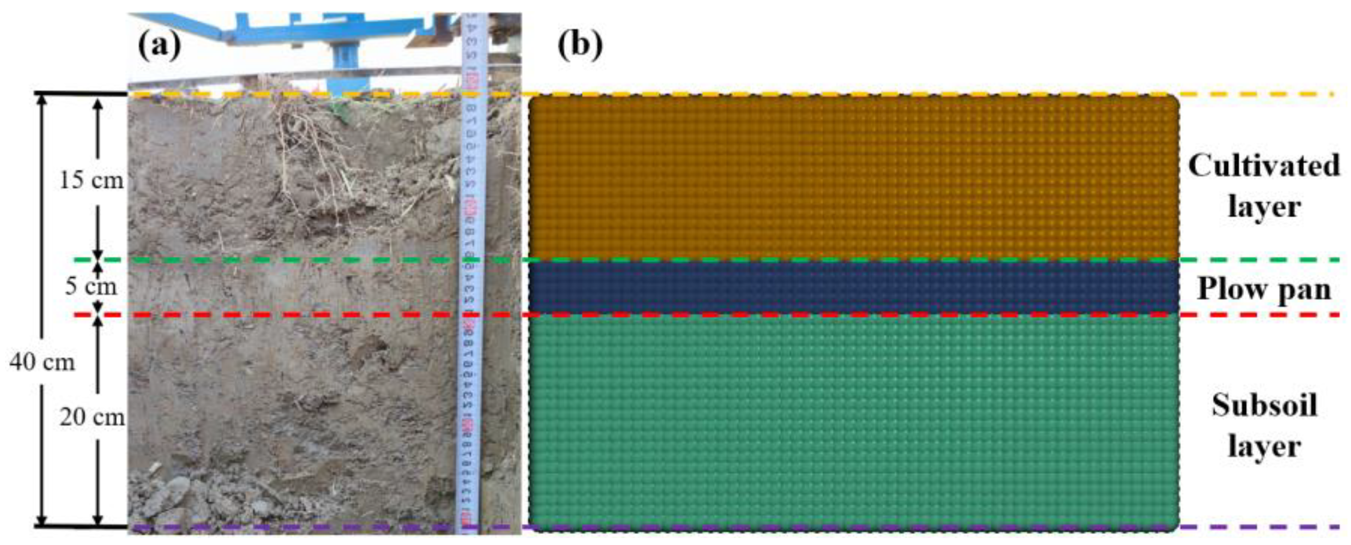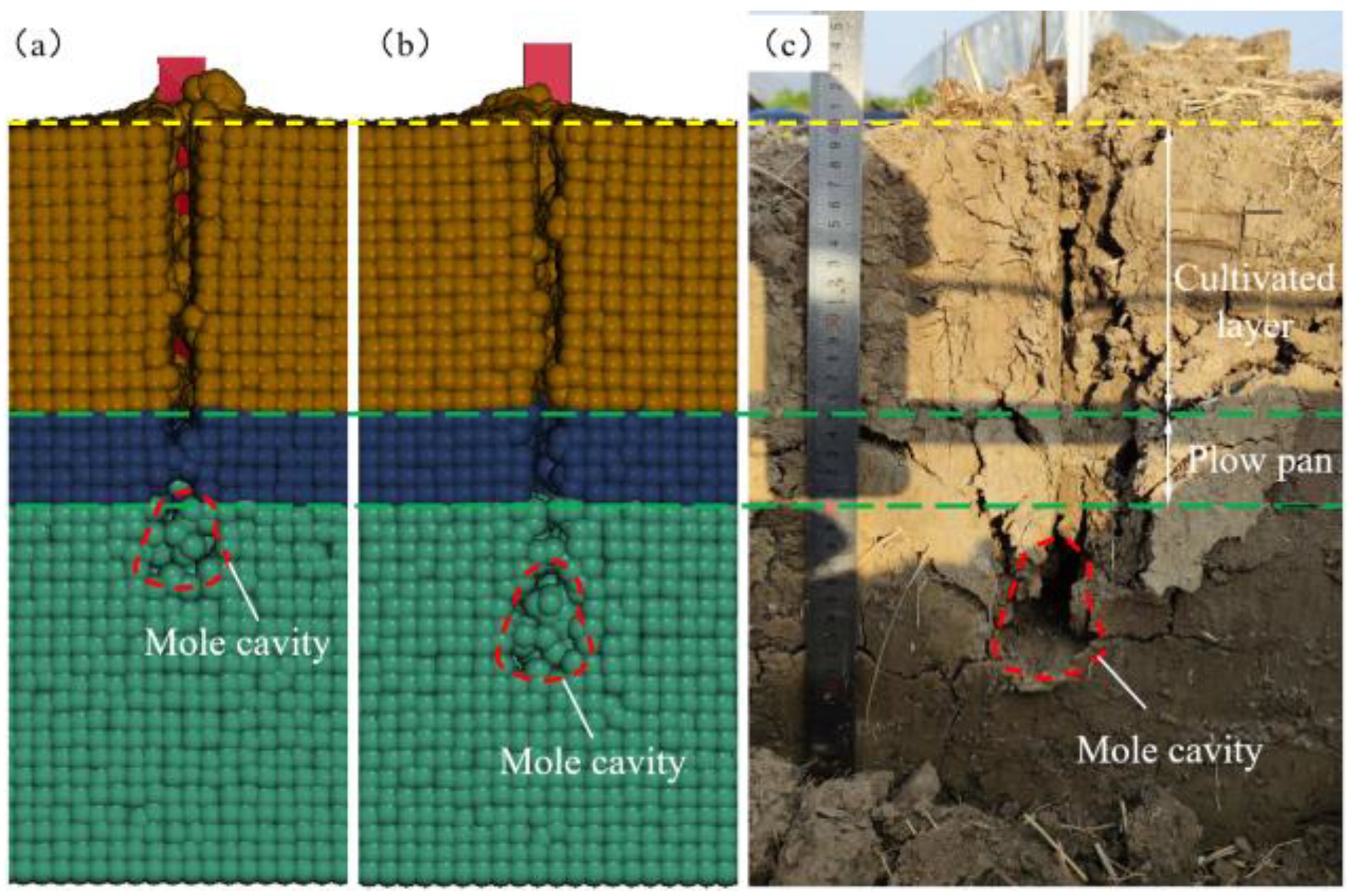 - Li, X.; Luo, Z.; Hao, Z.; Zheng, E.; Yao, H.; Zhu, Y.; Wang, X. Investigation on tillage resistance and soil disturbance in wet adhesive soil using discrete element method with three-layer soil-plough coupling model. Powder Technol. 2024, 436, 119463. [Google Scholar] [CrossRef]