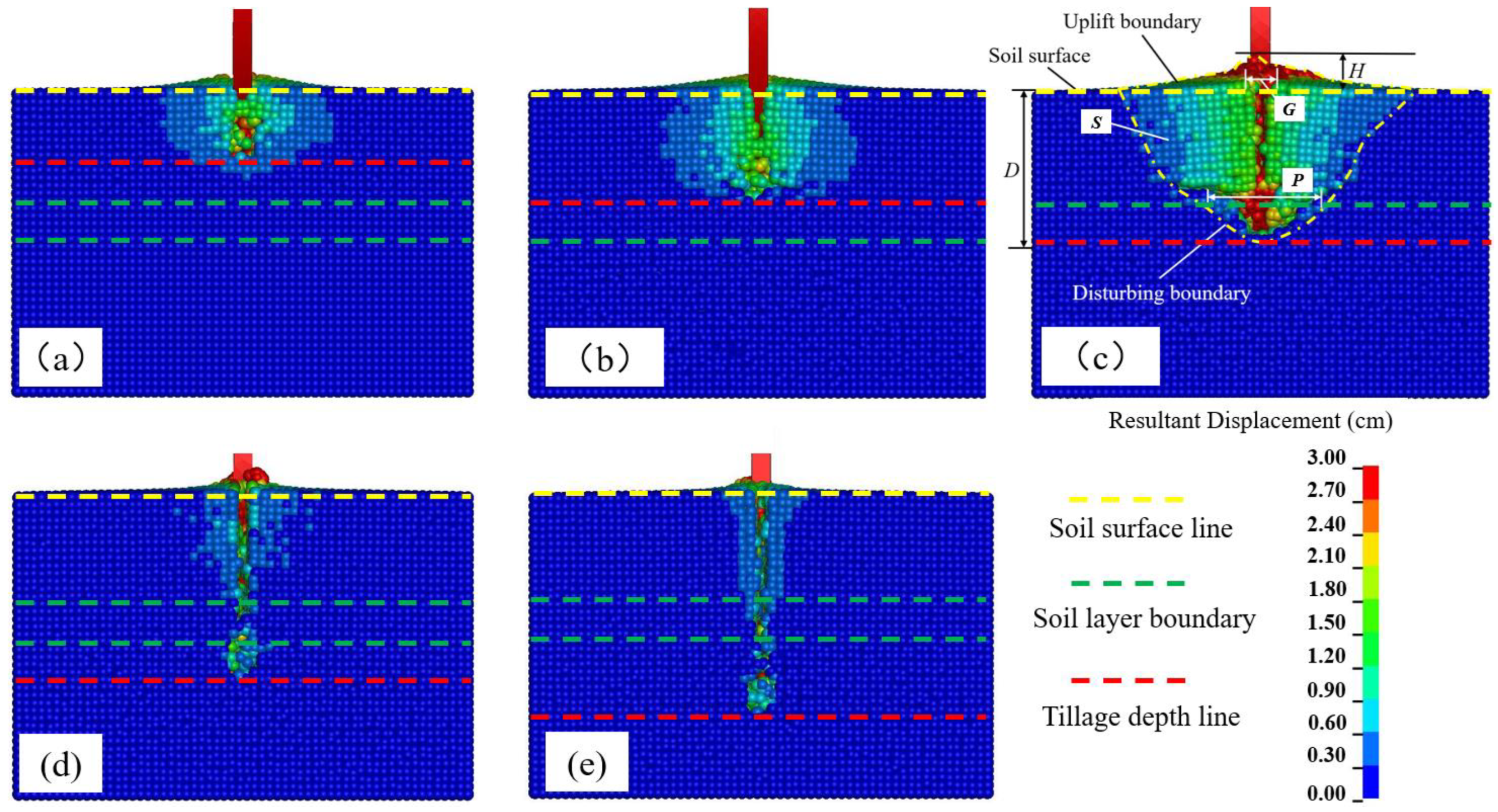 - From the movement process of soil particles with shallow to deep arrangement on the soil profile, it can be observed that the soil block above the tine was not lifted up as a big block but broken into many small soil blocks and then lifted up. Theoretically, the soil particles above the tine moved mainly upward and forward during subsoiling. However, this was not the case in practice. Therefore, in future research, the structure of the subsoiler should be optimized to ensure that all soil particles move upward and forward.