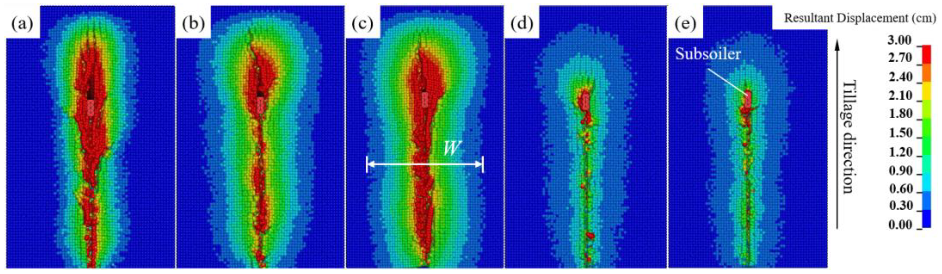 - Hang, C.; Gao, X.; Yuan, M.; Huang, Y.; Zhu, R. Discrete element simulations and experiments of soil disturbance as affected by the tine spacing of subsoiler. Biosyst. Eng. 2018, 168, 73–82. [Google Scholar] [CrossRef]