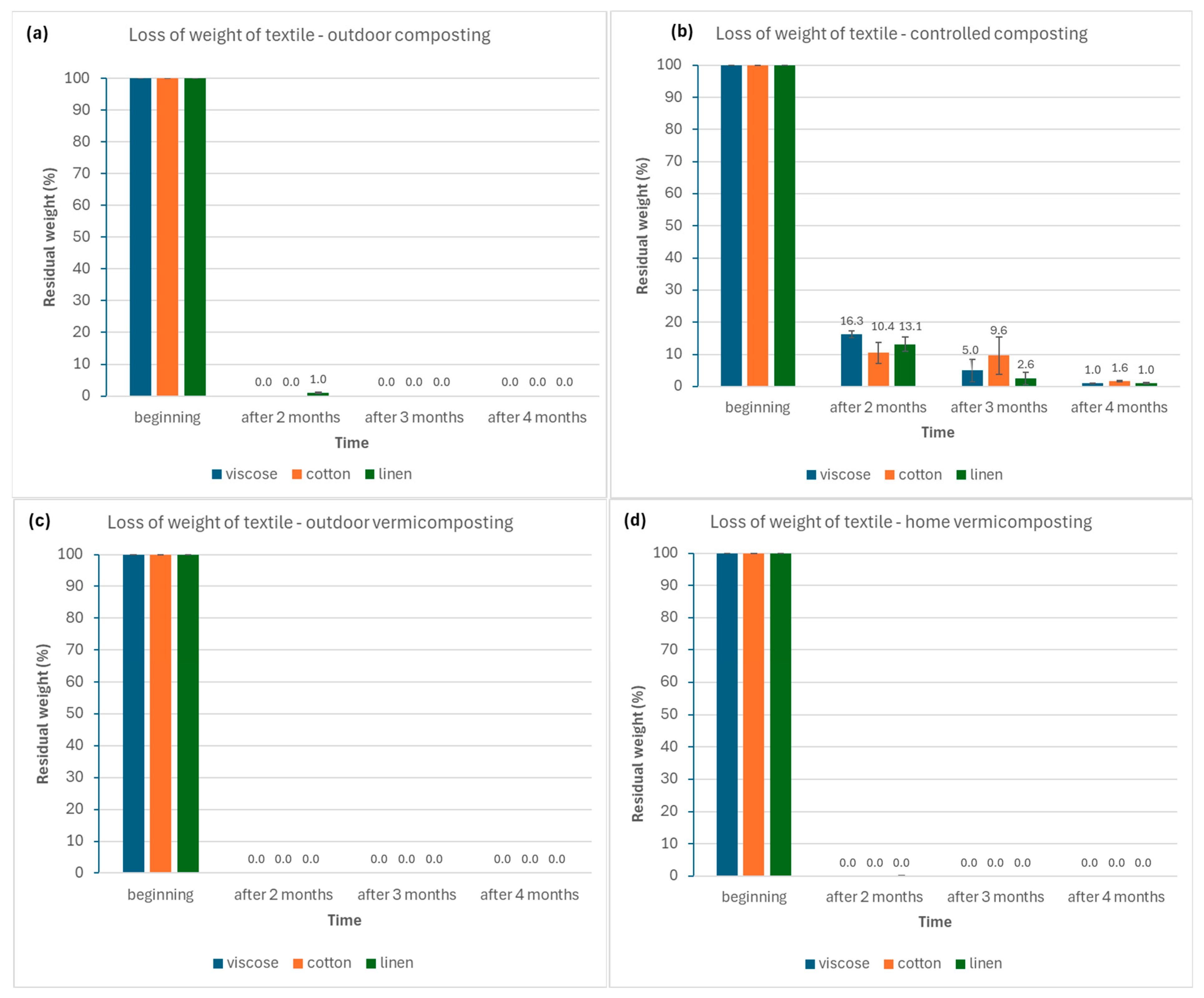For viscose, the outdoor composting system exhibited the highest vs. content at the second sampling (three months), followed by a gradual decline toward the third sampling, in line with organic matter stabilization. In outdoor vermicomposting, vs. values were initially higher than in composting systems but decreased steadily over time, reflecting enhanced decomposition mediated by earthworms.