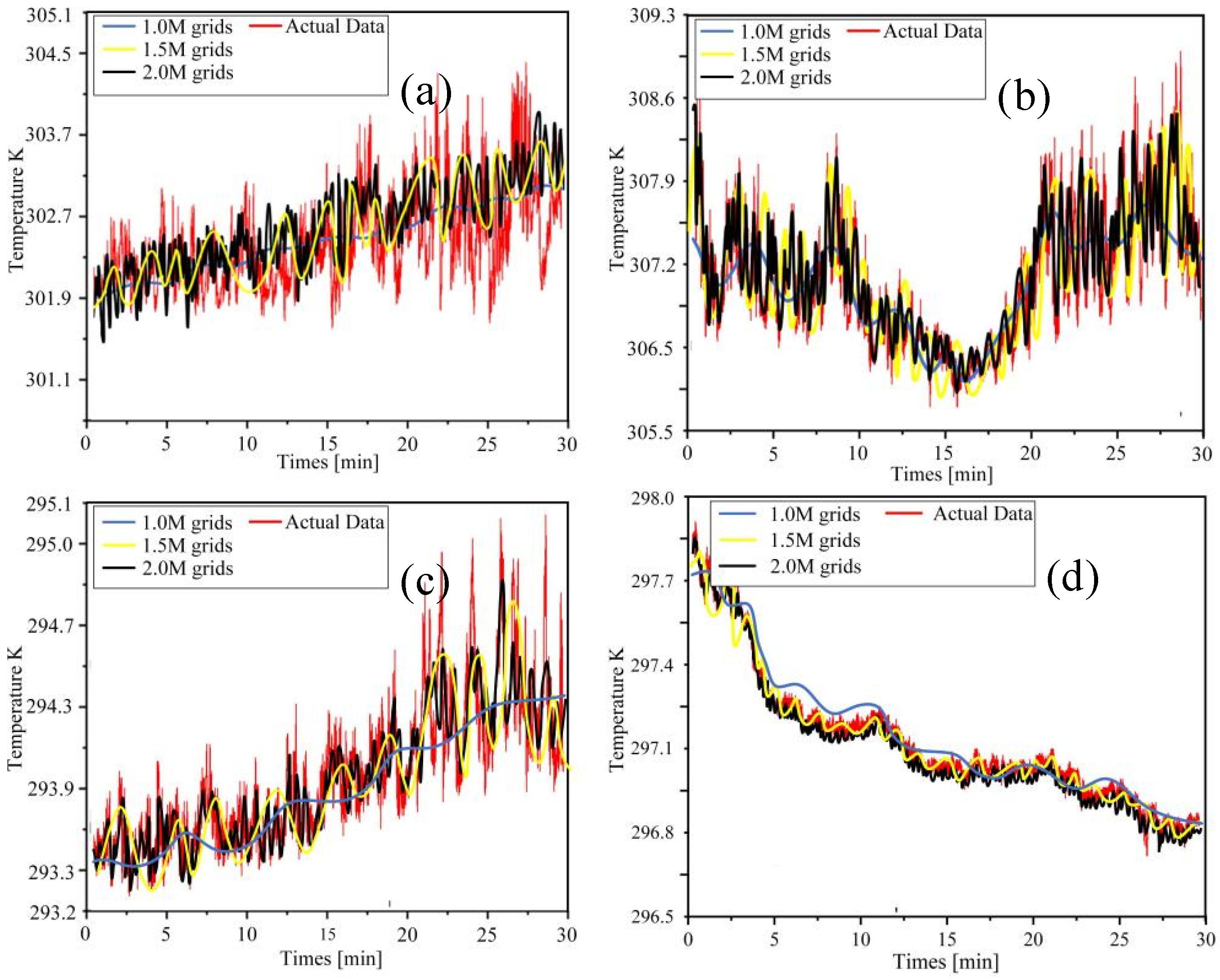 3.4. Analysis of High-Frequency Temperature Results from Actual and Simulated Data at Small and Large Time Scales Under the Large Eddy Simulation