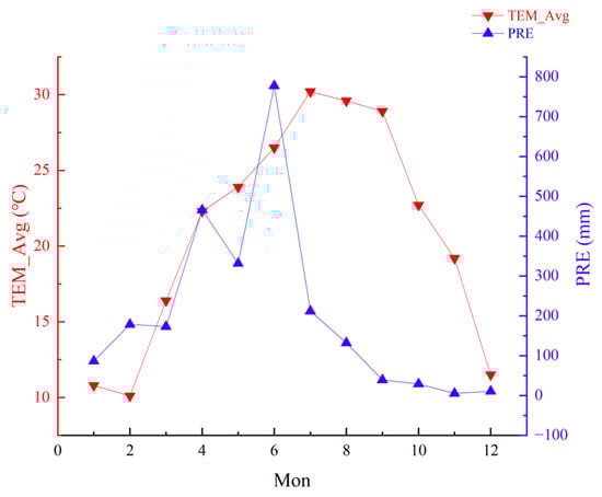 The experiment was conducted at the Guangxi Institute of Botany in Guilin, Guangxi Zhuang Autonomous Region, China (110°18.13′ E, 25°04′ N), at an elevation of approximately 163 m. The monthly average temperature (TEM_Avg, °C) and total monthly precipitation (PRE, mm) for Guilin City in 2024 are shown in Figure 1. The data were sourced from the Environmental Meteorological Data Service Platform (http://eia-data.com/, accessed on 23 August 2025).