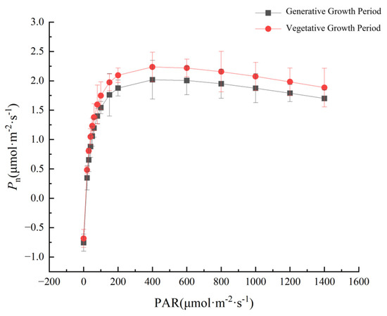 The photosynthetic response curves of P. parishii during the reproductive and nutrient growth periods, as shown in Figure 2, exhibit similar trends in both phases. At light intensities of 0 μmol·m−2·s−1 (PAR), net photosynthetic rates (Pn) remained consistently negative. As light intensity increased from 0 to 200 μmol·m−2·s−1, Pn rose sharply. Between 200 and 400 μmol·m−2·s−1 PAR, Pn continued to increase, though at a slower rate. However, when PAR exceeded 400 μmol·m−2·s−1, Pn declined as light intensity increased, indicating photoinhibition. Throughout the study, the net photosynthetic rate of P. parishii during the nutrient growth period consistently surpassed that observed during the reproductive growth period.