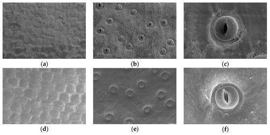 Leaf epidermal structure of P. parishii in different growth periods ((a): Upper epidermis of the leaf surface during the reproductive growth period. (b): Lower epidermis of the leaf surface during the reproductive growth period. (c): Stomata of the leaf surface during the reproductive growth period. (d): Upper epidermis of the leaf surface during the nutrient growth period. (e): Lower epidermis of the leaf surface during the nutrient growth period. (f): Stomata of the leaf surface during the nutrient growth period).