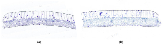 For photosynthetic determination, leaves from each plant were selected, cut along the midrib, and sectioned into 10 mm × 10 mm pieces [21]. These sections were fixed in FAA fixative (70% ethanol, formalin, glacial acetic acid in a 90:5:5 ratio), then dehydrated through a series of ethanol and xylene steps. The sections were embedded in paraffin, stained with toluidine blue, and sealed with neutral gum. The samples were observed and photographed under an optical microscope, and microscopic parameters were measured using the graphical analysis software CaseViewer 2.4. The following parameters were measured: upper epidermal thickness (UET), lower epidermal thickness (LET), leaf thickness (LT), and mesophyll tissue thickness (MT). Each sample was randomly observed in 10 visual fields, and statistical values were obtained for each.