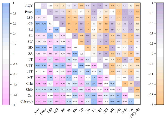 Correlation analysis of leaf structure and photosynthetic physiology. (Upper triangle: Reproductive growth period; lower triangle: Nutrient growth period; * indicates p < 0.05; ** means p < 0.01).