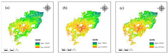 Figure 4). The results indicate that the overall spatial pattern of SOM remained consistent across the three years, with high-value areas in the northeast and low-value areas in the central region, exhibiting a clear spatial gradient.