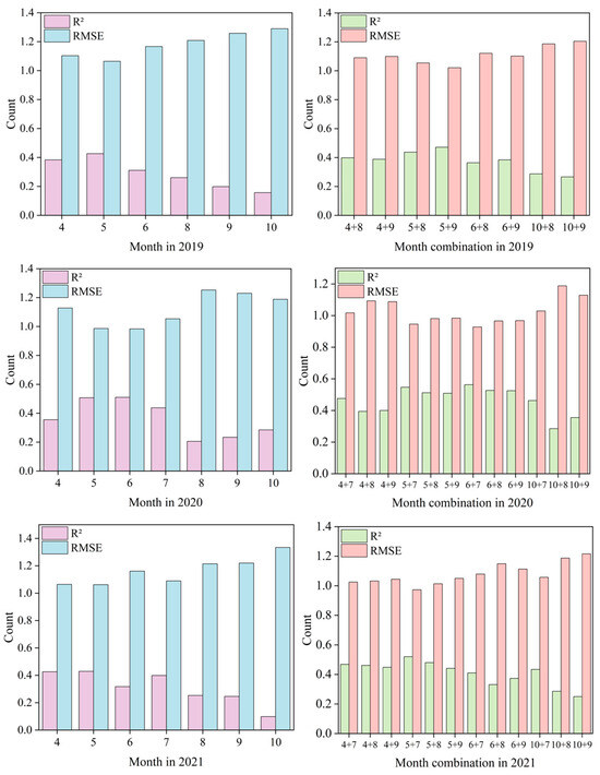 In 2019, the optimal combination (May + September) saw R2 increase from 0.471 to 0.537, and RMSE decrease from 1.021 to 0.956 g·kg−1. In 2020, the optimal combination (May + July) achieved an R2 increase from 0.547 to 0.588 and RMSE decrease from 0.946 to 0.901 g·kg−1. In 2021, the optimal combination (May + July) showed R2 improvement from 0.520 to 0.566 and RMSE reduction from 0.973 to 0.926 g·kg−1.