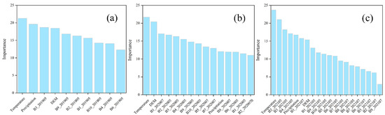 In 2019, the optimal combination was May + September, with R2 increasing from 0.537 to 0.544 and RMSE decreasing from 0.956 to 0.949 g·kg−1, showing a limited improvement. The most pronounced effect was observed in 2020, where the optimal combination (May + July) achieved R2 of 0.609 and RMSE of 0.879 g·kg−1 after feature selection, representing the largest improvement among the three years. This suggests that the original feature set in 2020 contained more redundant or noisy variables, and feature selection effectively removed interfering information, thereby enhancing model generalization and stability. The notable improvement may also be associated with 2020 being a normal climatic year, where the remote sensing and environmental variables were well-balanced, making it easier for the selection strategy to identify key driving variables. In 2021, the May + July combination saw R2 increase from 0.566 to 0.578 and RMSE decrease from 0.926 to 0.913 g·kg−1 after feature selection. Although the improvement was smaller than in 2020, it still outperformed 2019, demonstrating a certain degree of robustness.